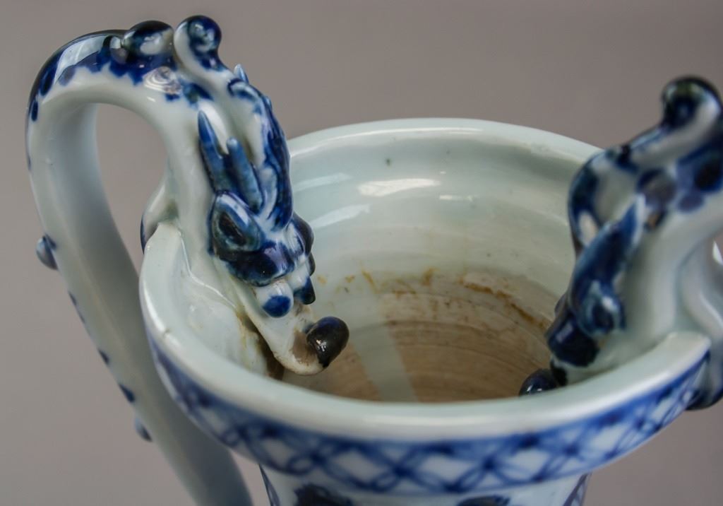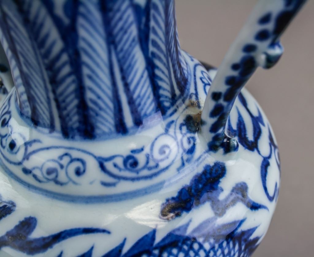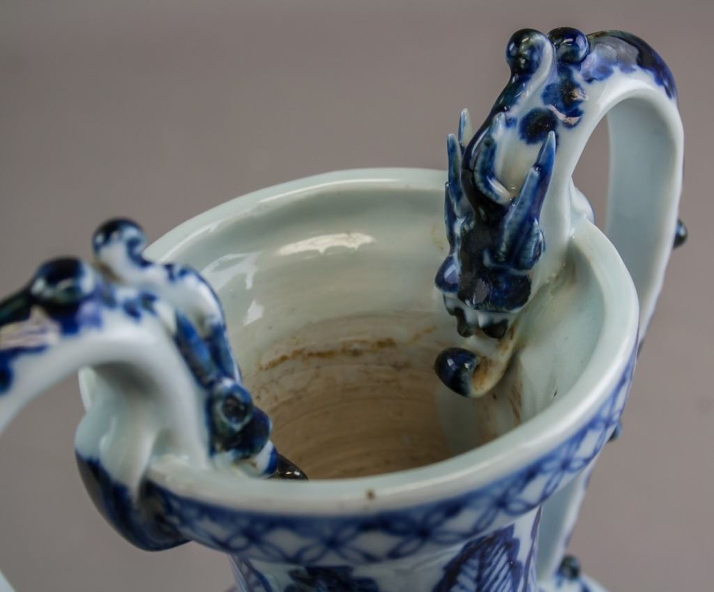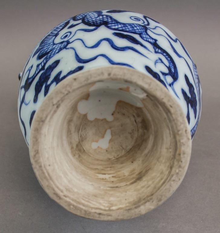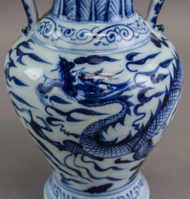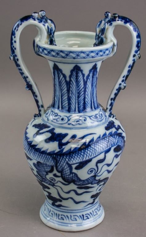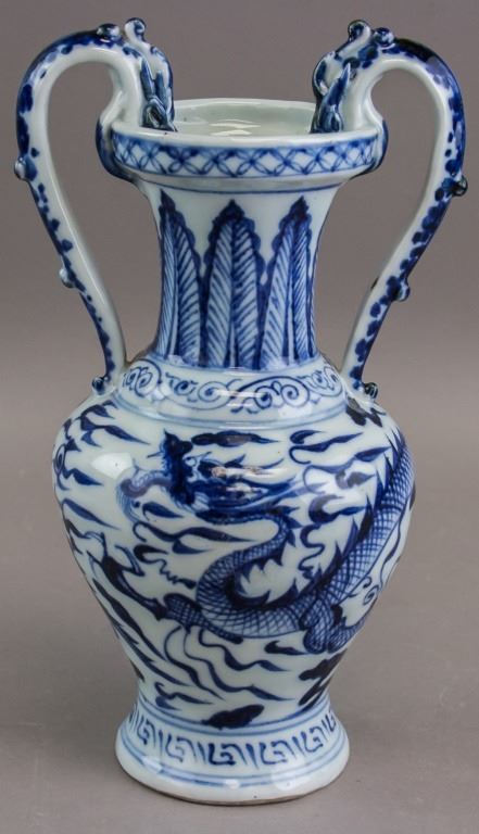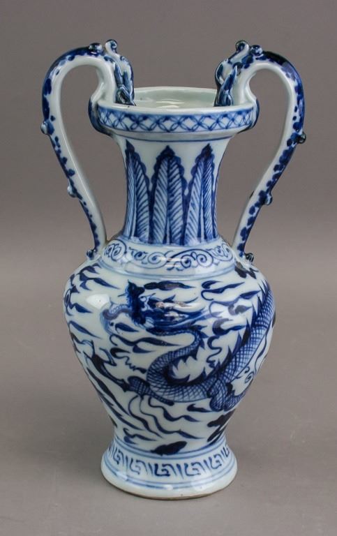 Chinese porcelain vase. Of Ming blue and white style. Of large round opening with lip and tall neck. With ovoid body resting on tall foot rim. With two dragon shaped handles curving up from the shoulders to over the rim. Painted with dragon. 26 x 15 cm. 733 grams.