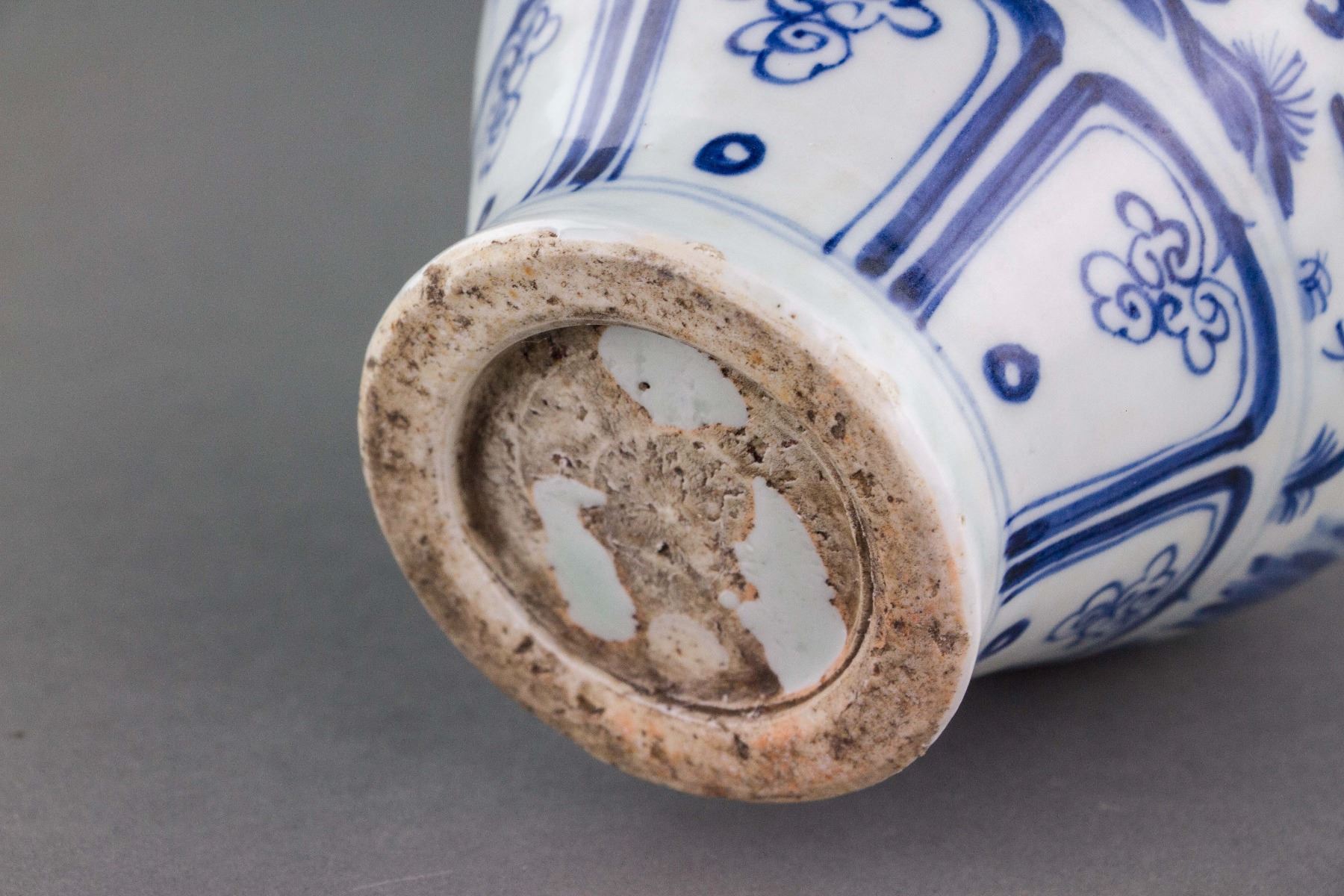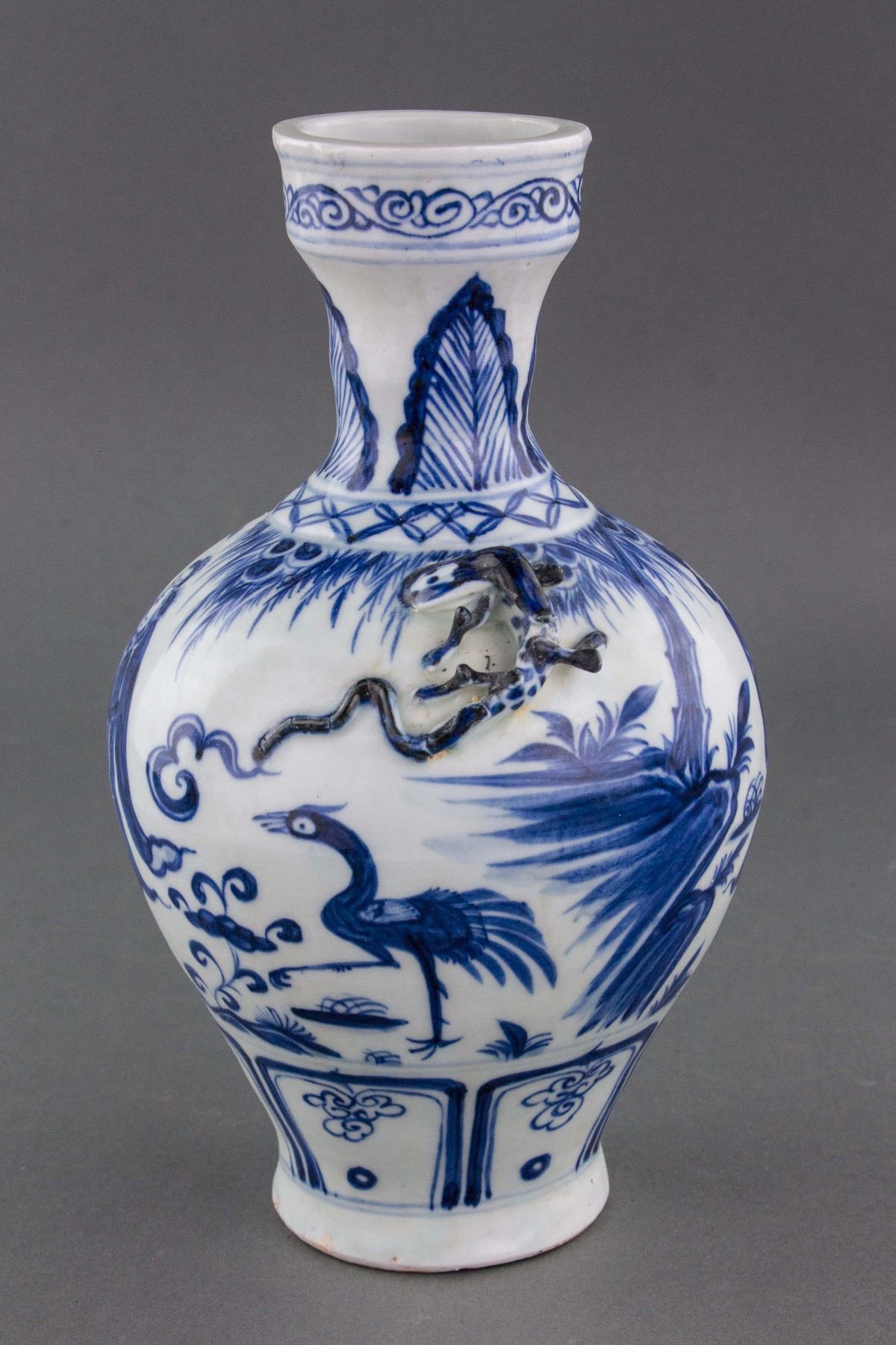 Chinese Ming style blue and white porcelain vase; of ovoid form body; flanked with two dragon form ears; painted with scholars, cranes and trees; decorated with floral and leafy pattern; 15 cm x 24 cm, 921 grams