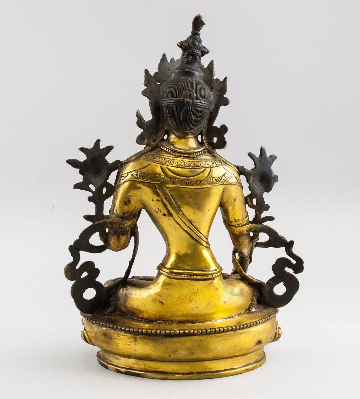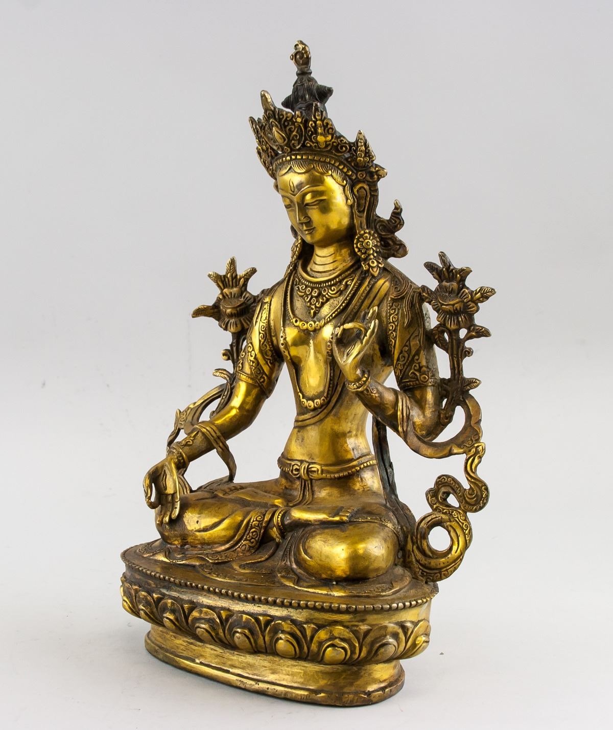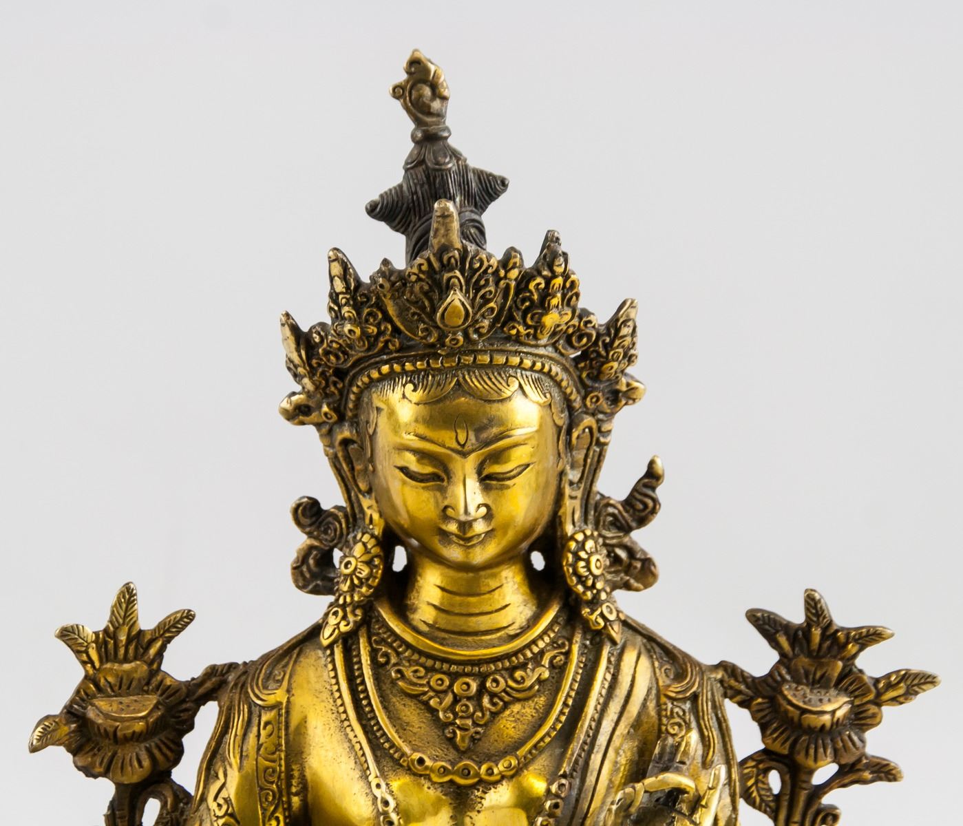 Chinese Ming styel gilt bronze statue. Featuring seated Green Tara. With crossed thunderbolt mark on base. 35 x 22 cm, 1990 grams
