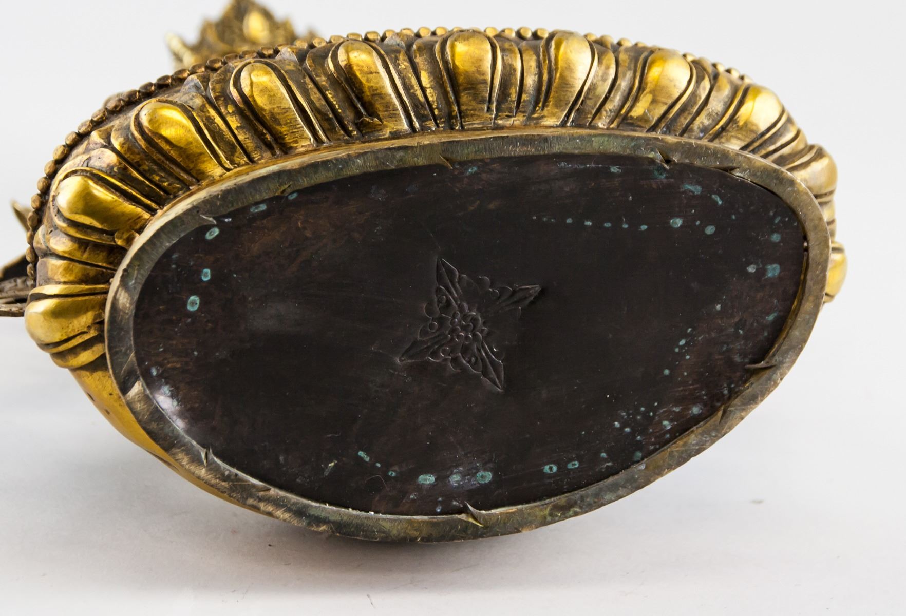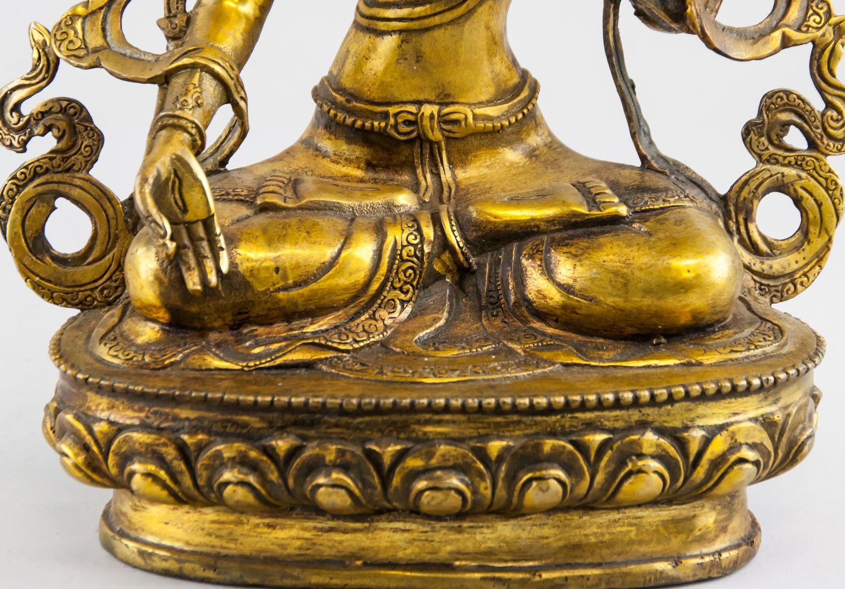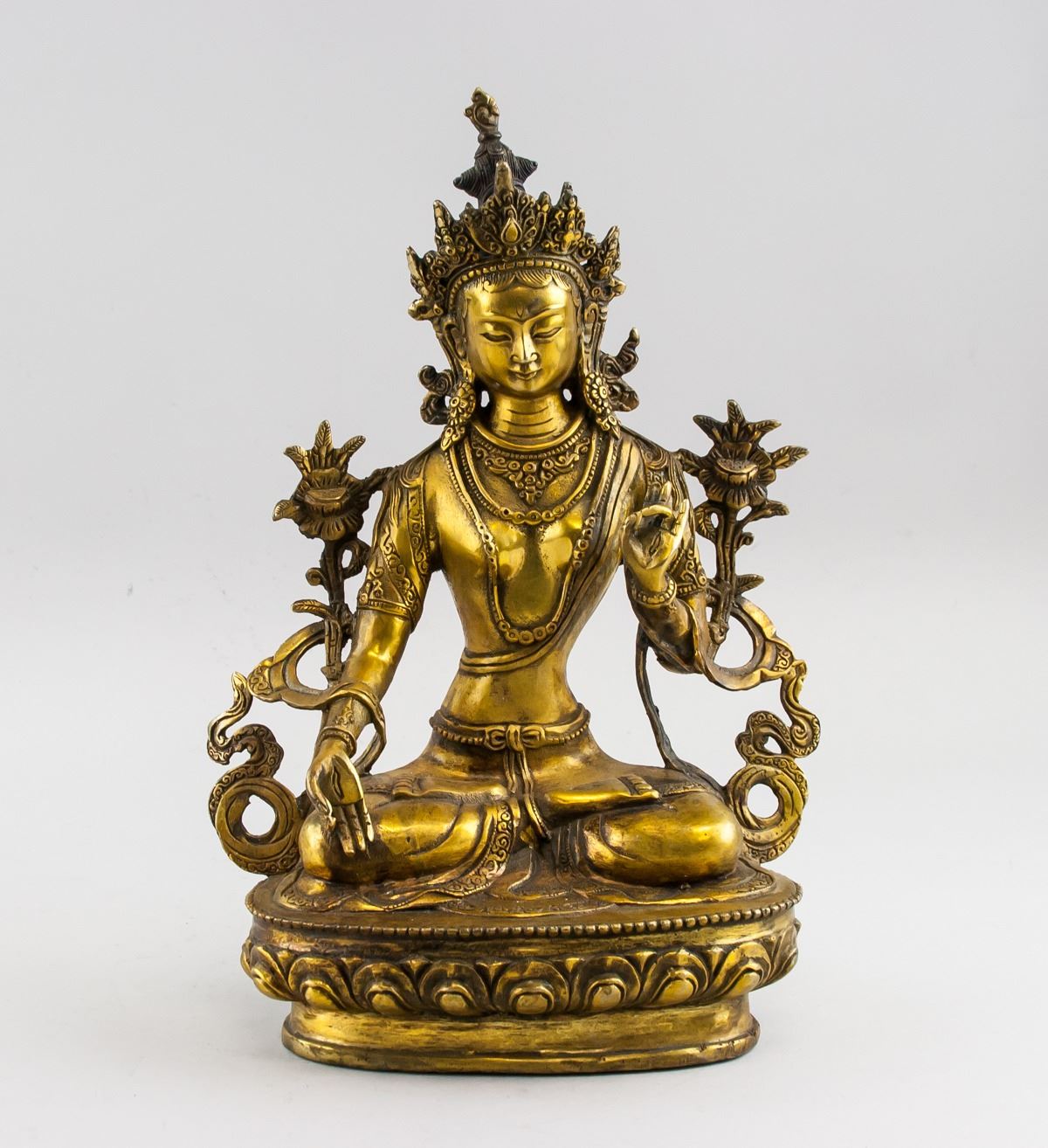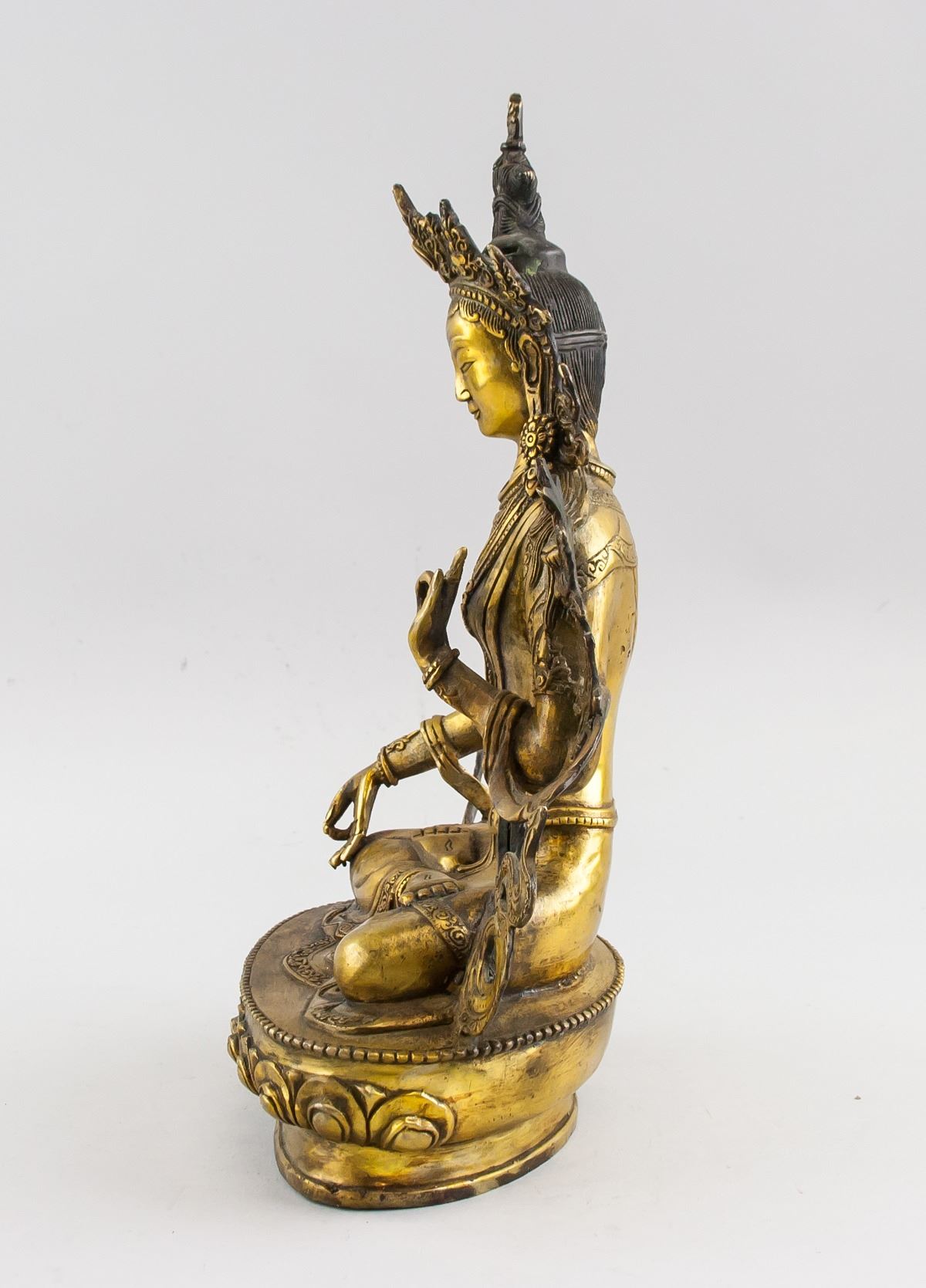 Chinese Ming styel gilt bronze statue. Featuring seated Green Tara. With crossed thunderbolt mark on base. 35 x 22 cm, 1990 grams
