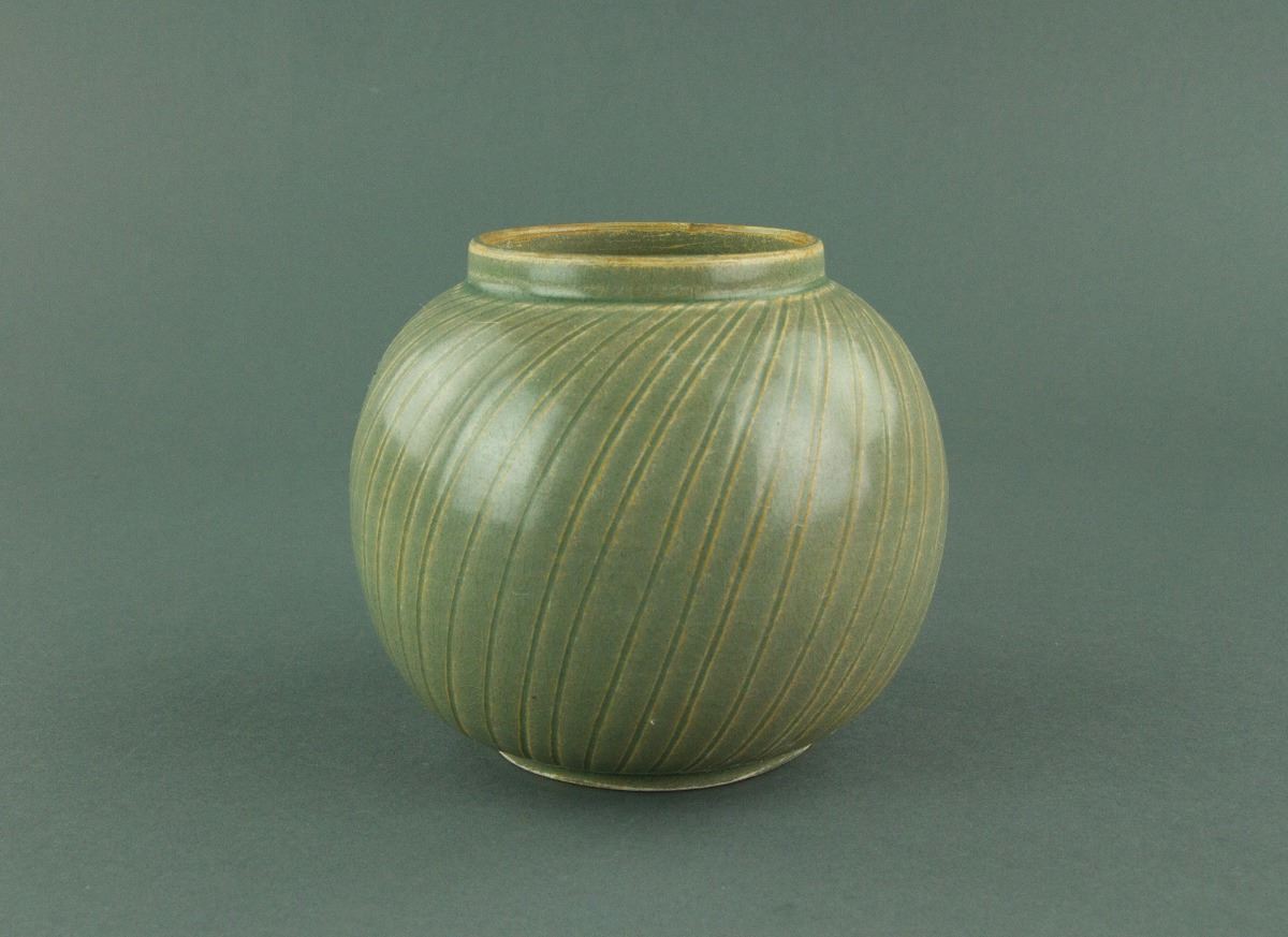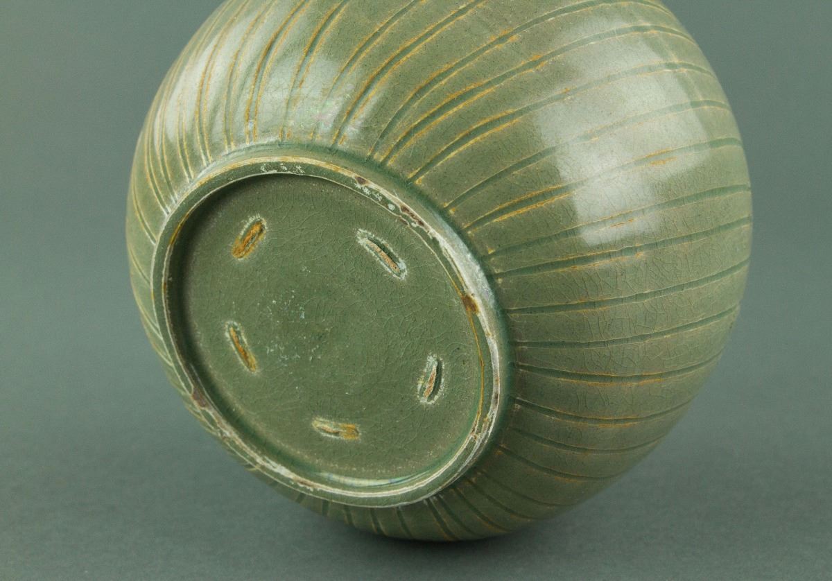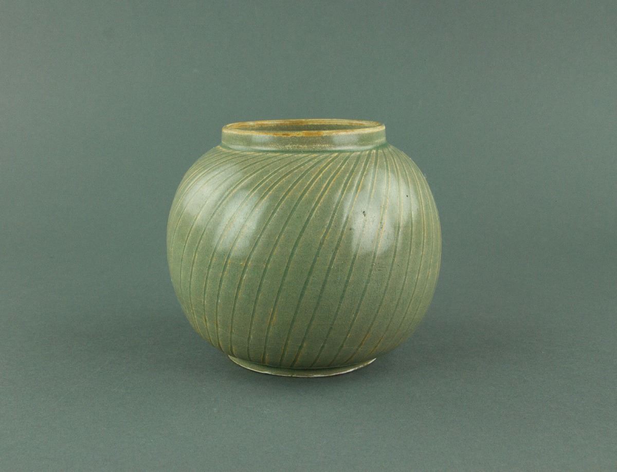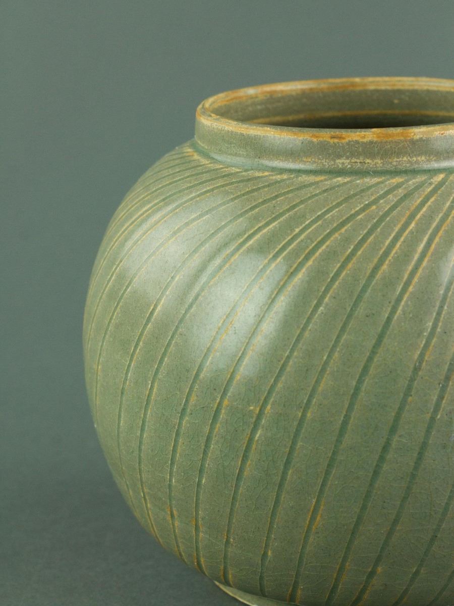 Chinese Longquan porcelain jar; Ming style; of globular body with straight mouth rim; covered in celadon glaze; incised with slender leaning ribs; with five spur marks on base; H: 13 cm, D: 14 cm, 645 grams