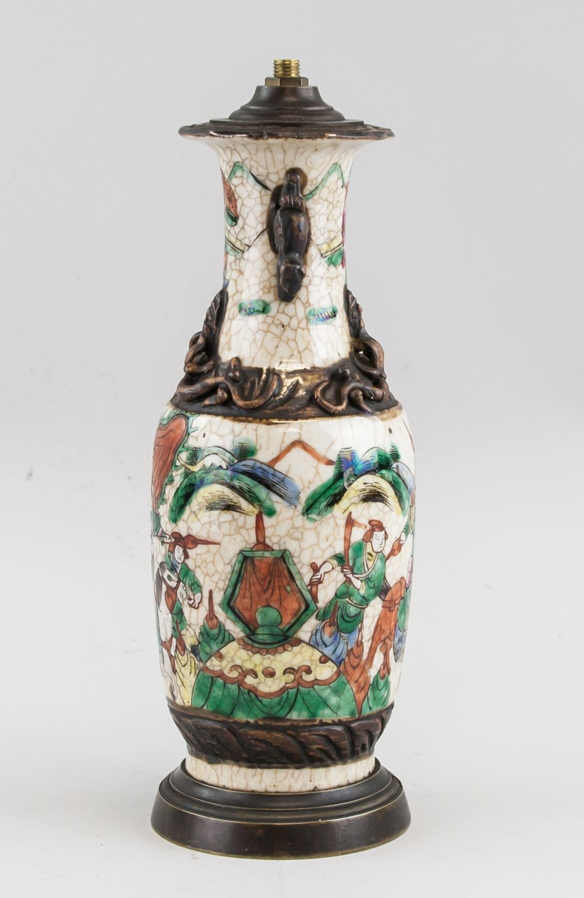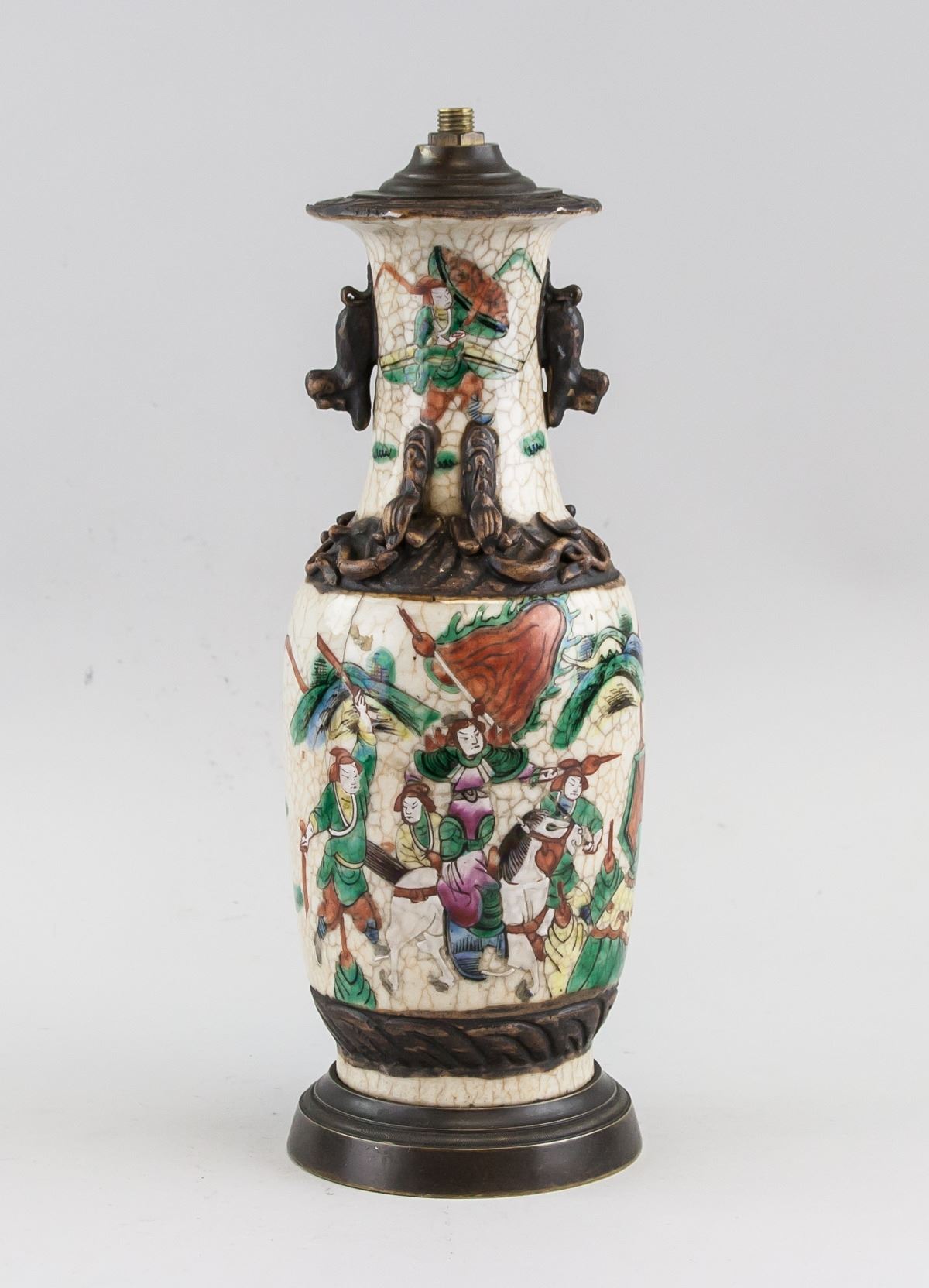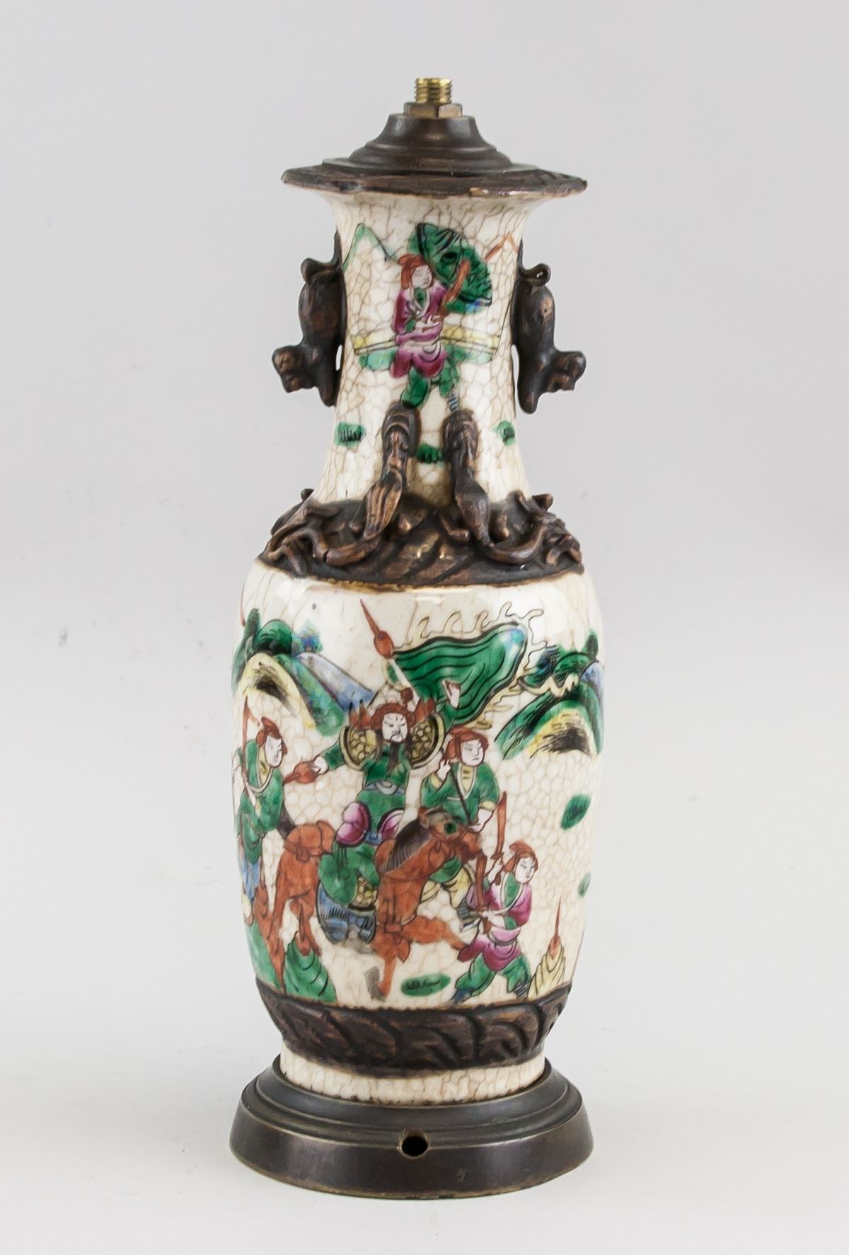 Chinese Ming style porcelain vase lamp. Of cylinder form body. Carved with dragon and shoulder. Flanked with two beast form handles. Painted with warriors. With metal base and top. Without electrical parts. 31 x 12 cm, 1428 grams