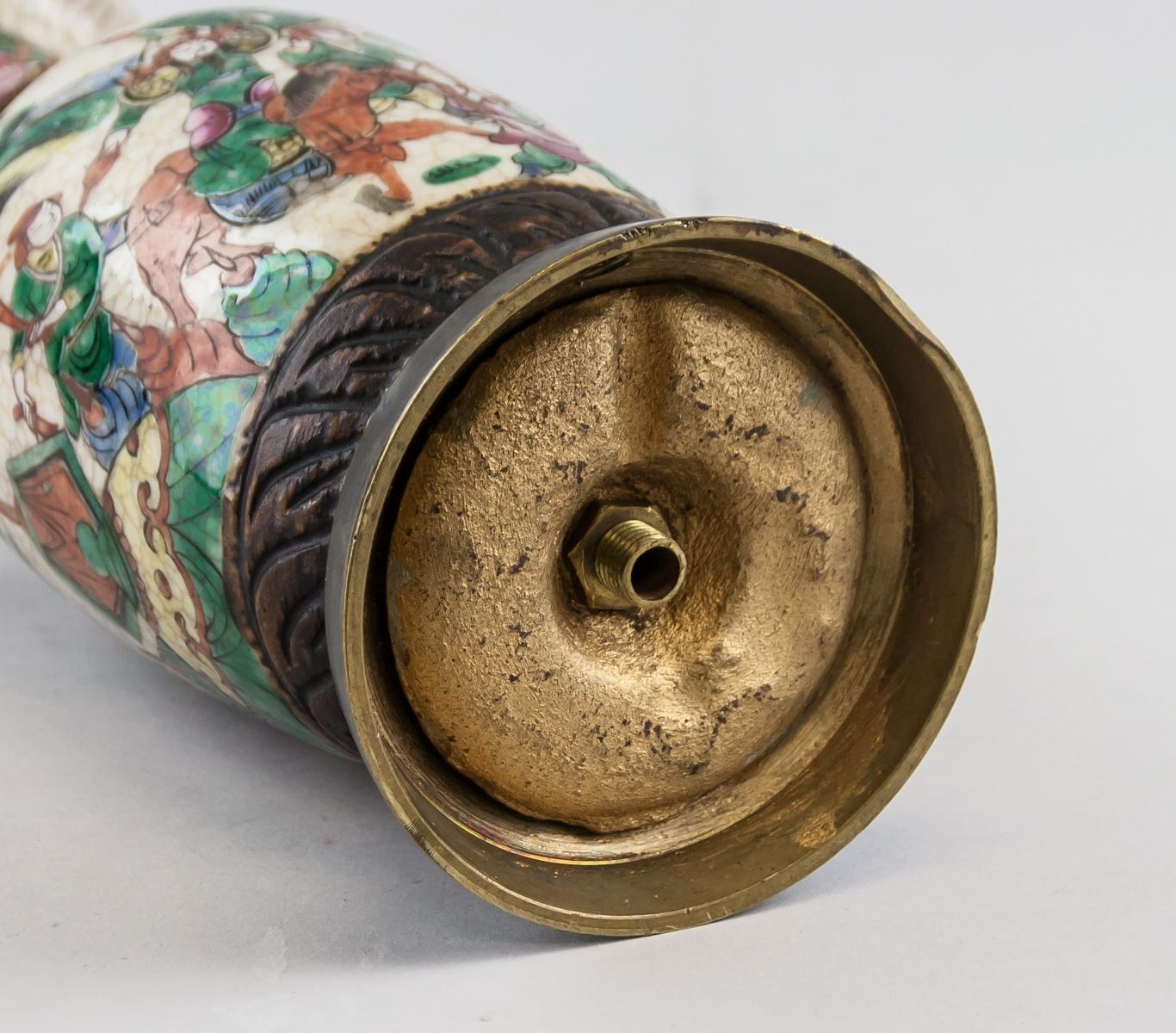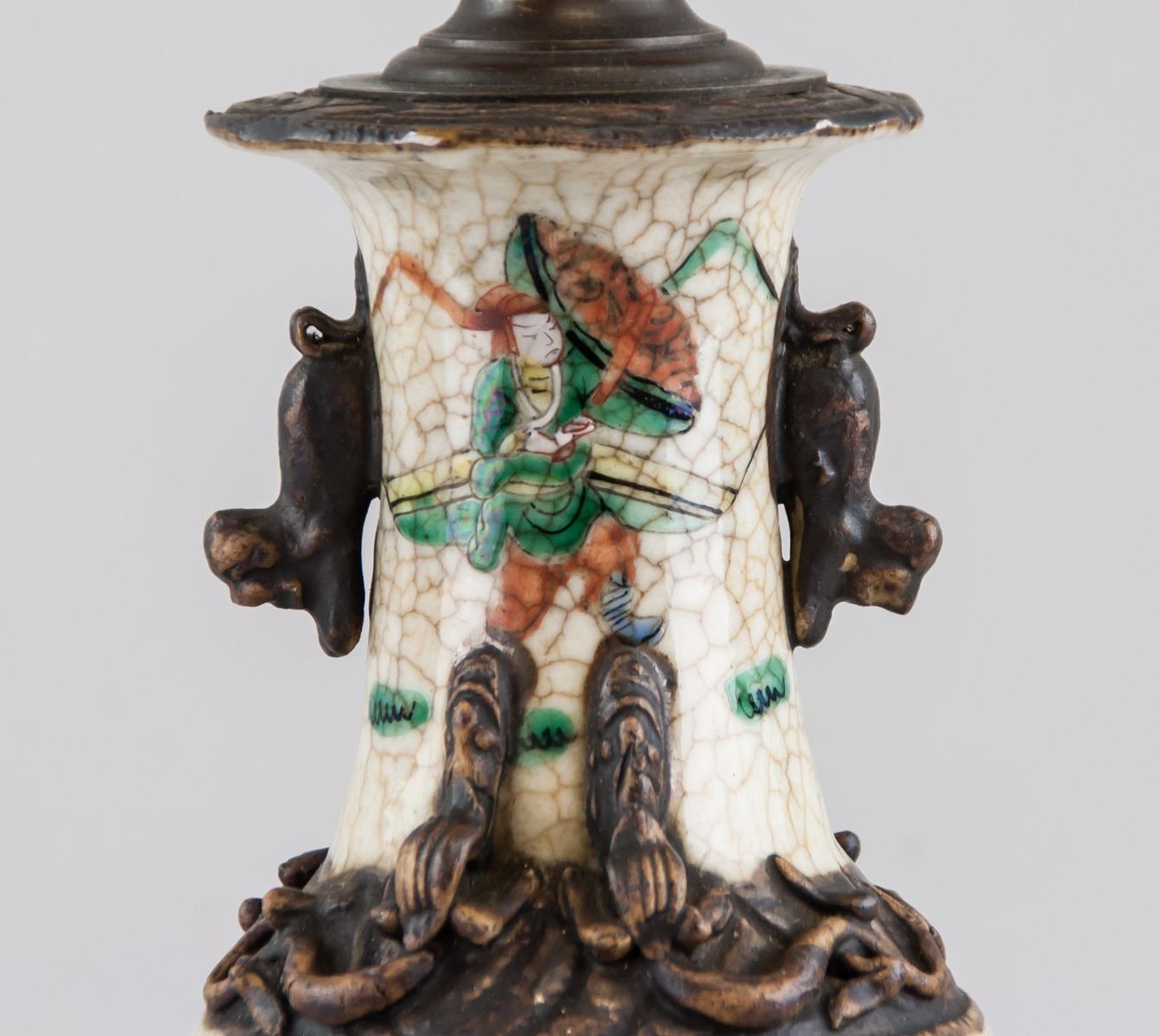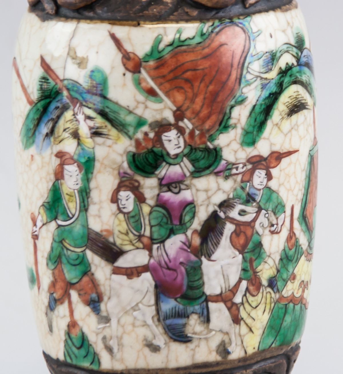 Chinese Ming style porcelain vase lamp. Of cylinder form body. Carved with dragon and shoulder. Flanked with two beast form handles. Painted with warriors. With metal base and top. Without electrical parts. 31 x 12 cm, 1428 grams
