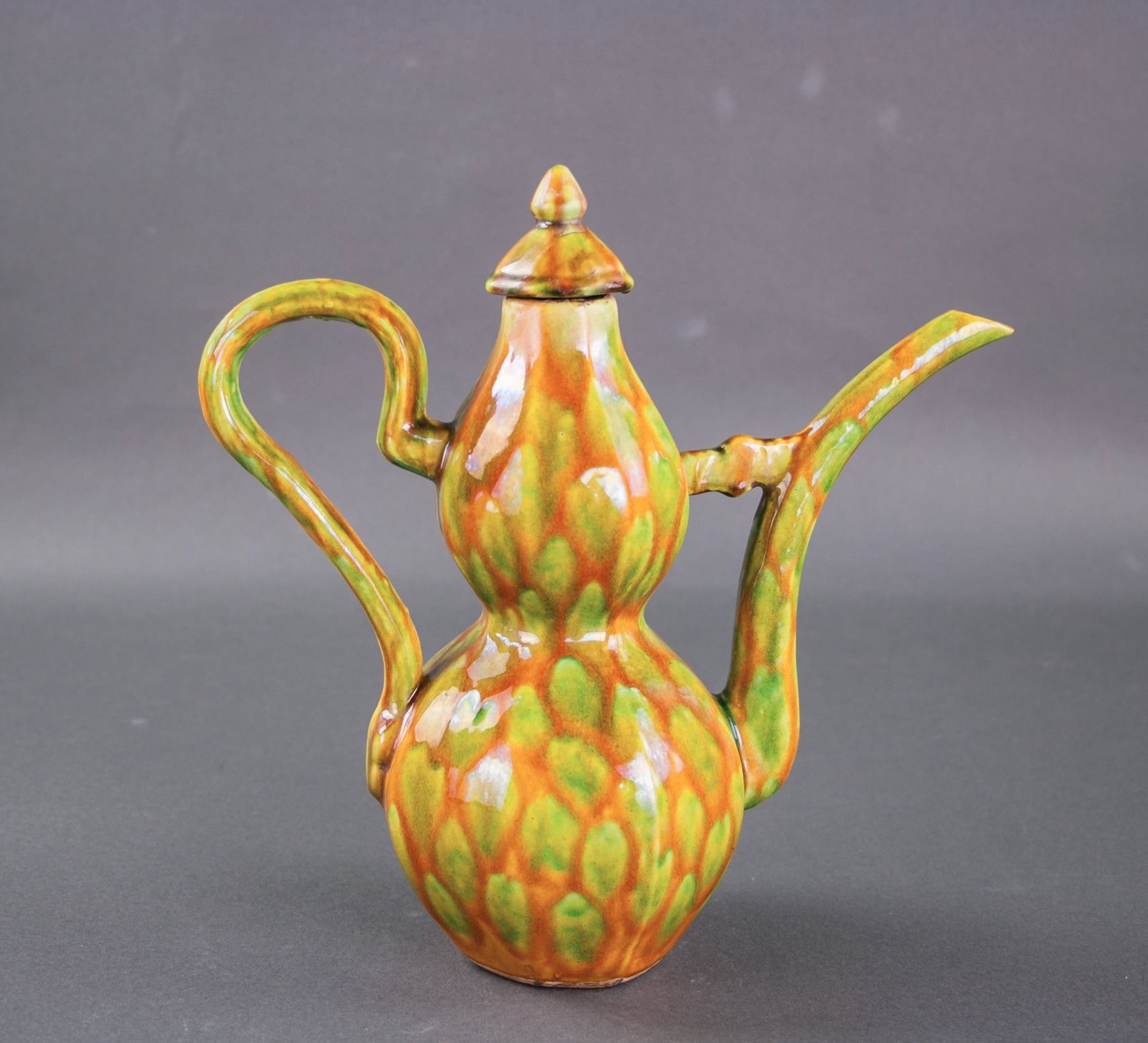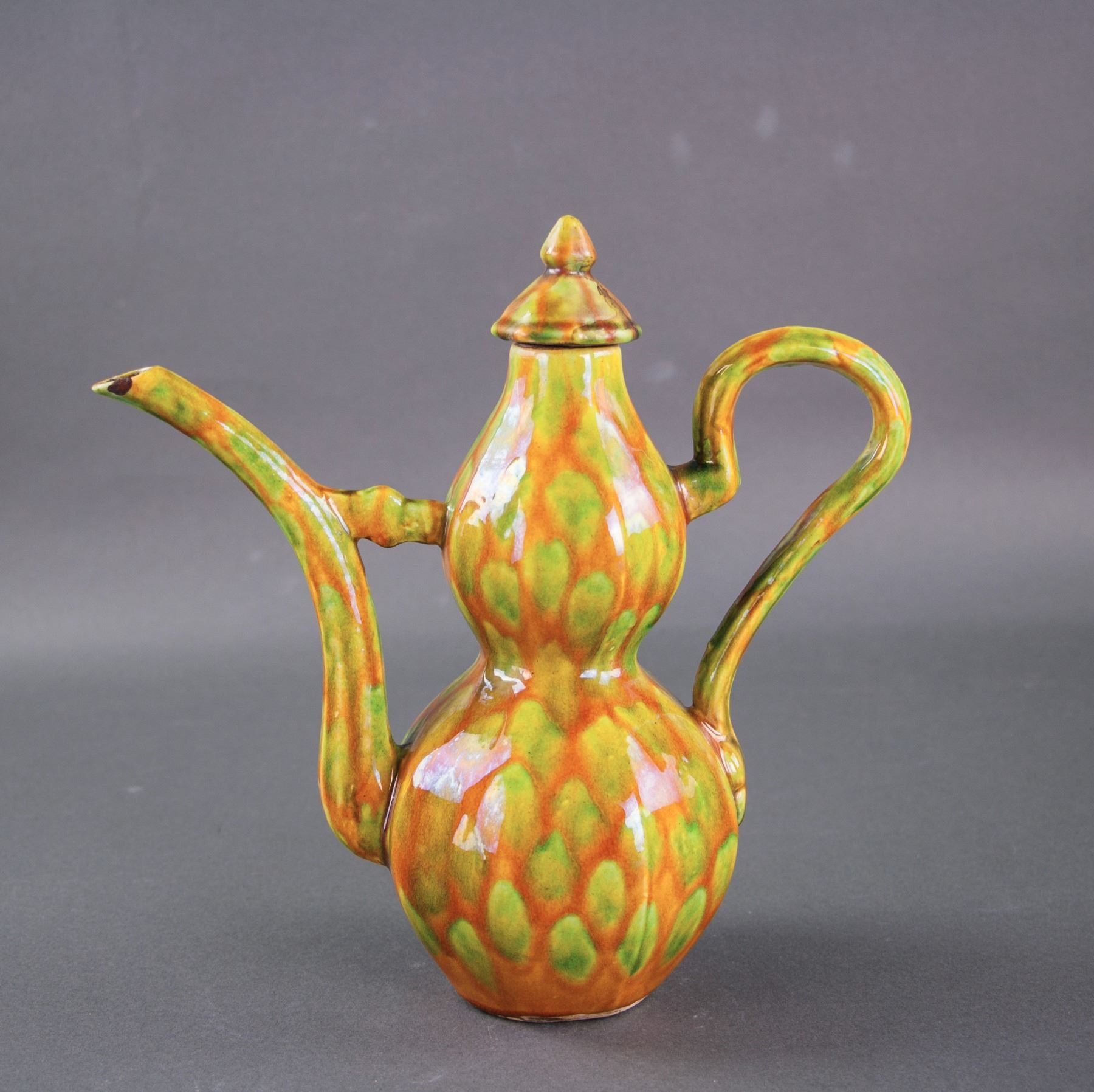 Chinese Ming style imperial porcelain wine pot; of gourd form body; flanked with long curved spout and handle; covered by mixed yellow and green glaze; six-character Hongzhi mark on base; 23 cm x 10.5 cm x 23.8 cm, 774 grams