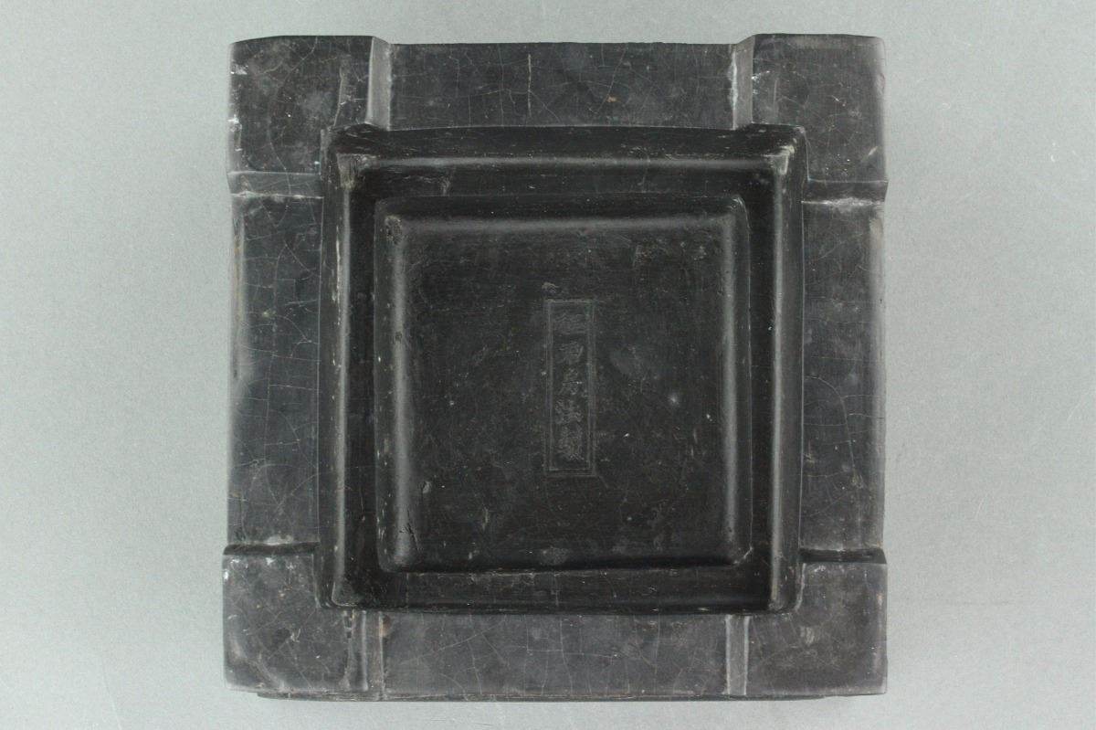 Chinese gilt ink stone; of square form; featuring eighteen arhats scene on four sides; carved calligraphy script on top; artist Cheng Junfang (1541–ca. 1620 Ming Wanli) mark on base; H: 8 cm, L: 17 cm, W: 17 cm, 2026 grams