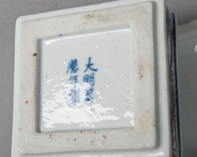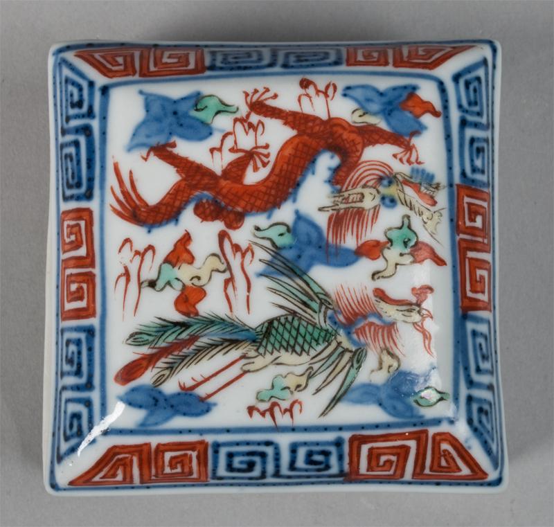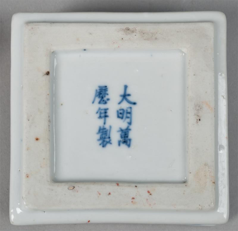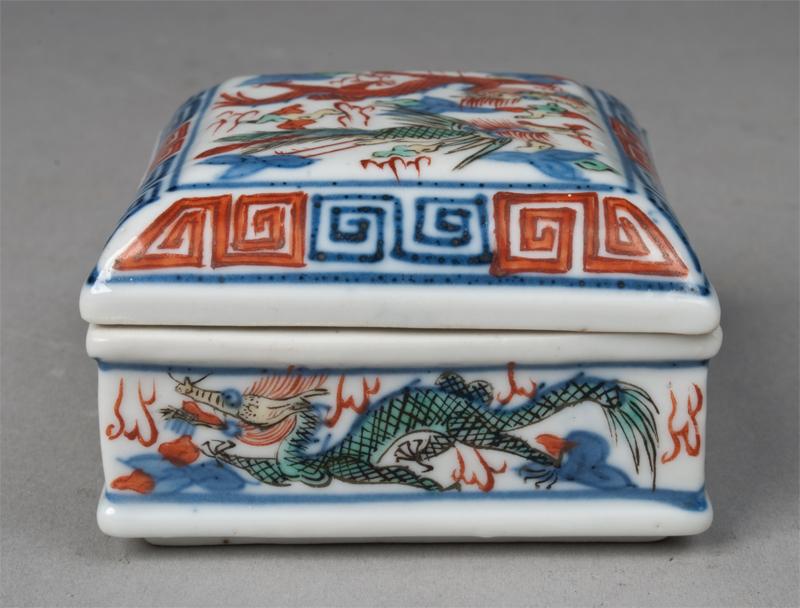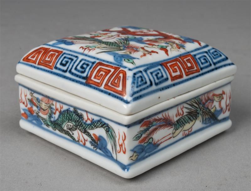 Finley painted in five colors to depict a five clawed dragon and Phoenix chasing a flaming pearl amongst ruyi, the sides painted with alternating dragons and Phoenix amongst ruyi, the base with six character mark in underglaze blue for Great Ming Wanli production (1573 - 1619). 2.5"Sq x 1.75"H, circa 19th century.