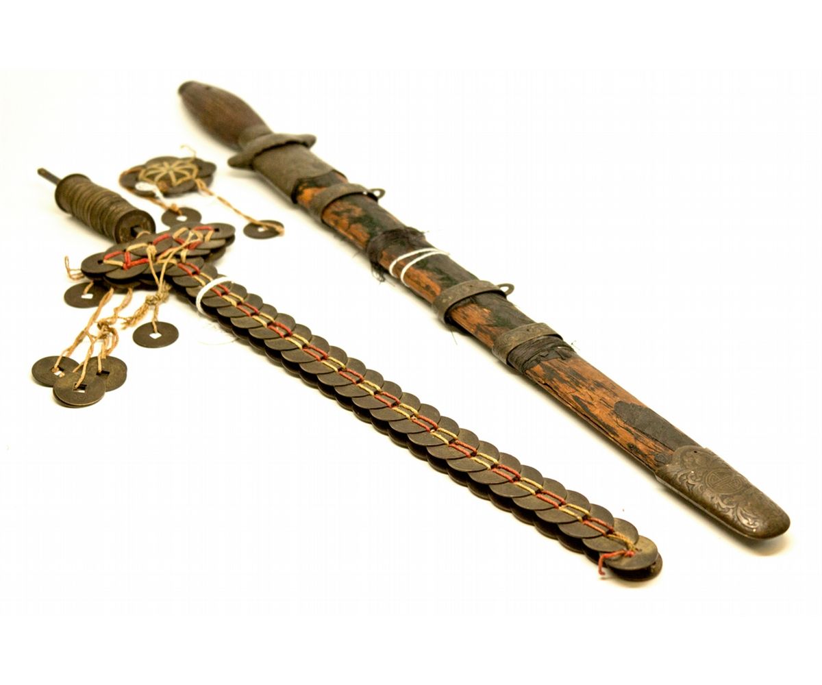 Lot of 2: 1) Coin sword, possibly made in the 19th Century by Chinese workers in mining communities. The purpose of a coin sword, which was typically mounted over someone`s bed, was to ward away evil spirits. Measures 16.75", there is some wear on the handle and a piece has fallen off. 2) Sword with holder. Sword measures 20.75” and holder measures 17.25". There is some wear and also a crack on the handle. As a young mining geologist, Fred Holabird remembers discovering similar swords while working in Eureka, NV. These swords serve as important tokens of the past, and to remember the many immigrants who came to the Western U.S. During the 19th Century. - Woodward Collection -60292