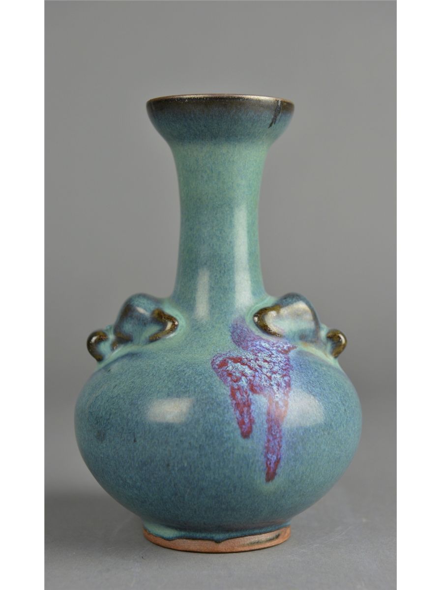 Chinese Junyao porcelain vase; featuring molded ox head handles; H: 17 cm, D: 12 cm