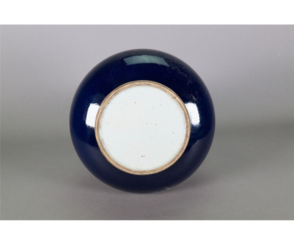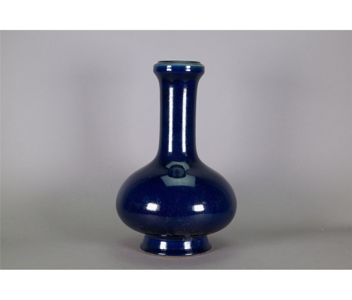 Chinese Monochrome blue glazed vase; of oval body form with long neck and garlic-shaped opening; supported on everted foot rim; H: 36 cm, D: 26 cm, 3912 grams