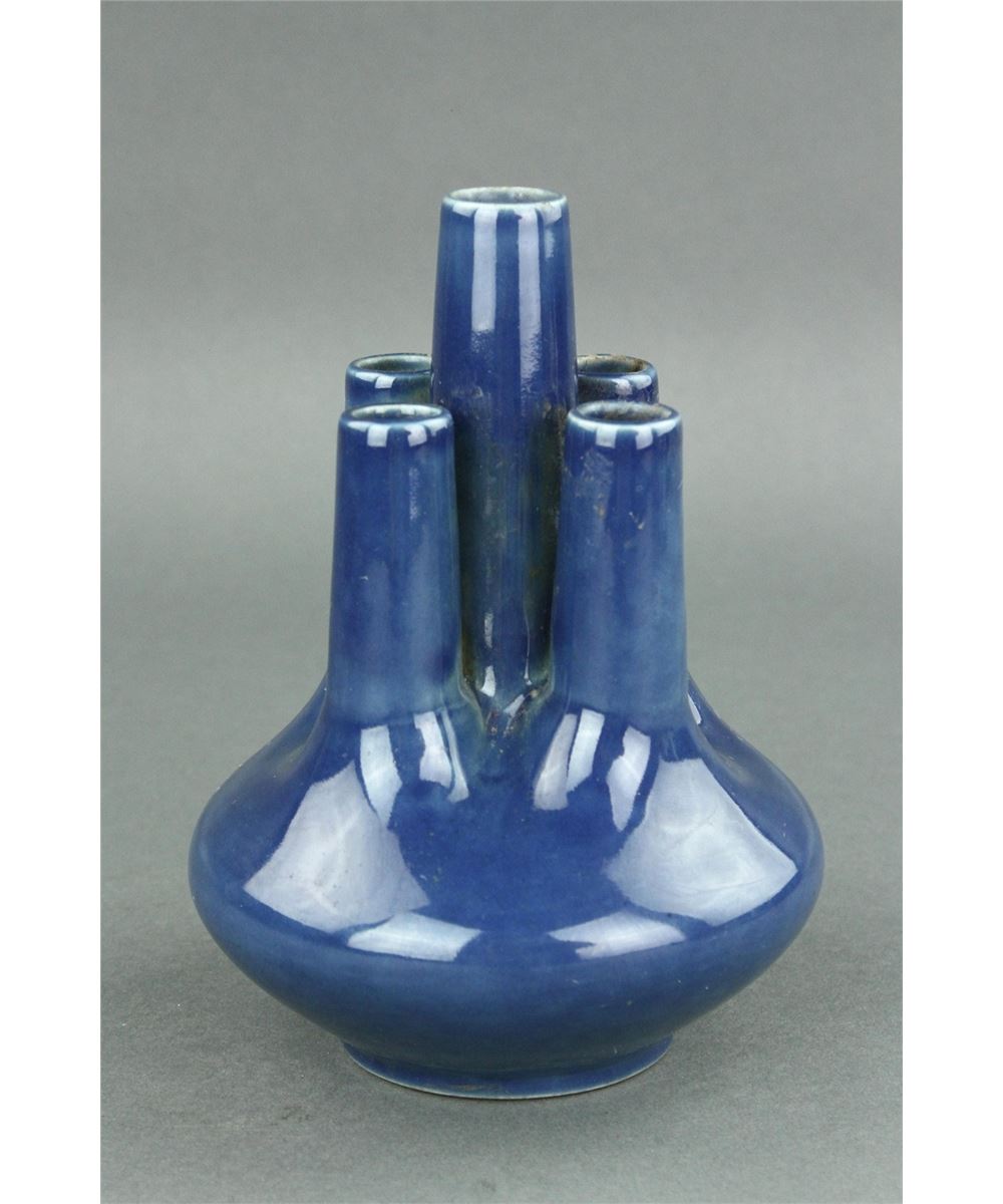 Chinese blue ground porcelain vase; with steep sides tapering towards the five cylindrical openings; six-character Daoguang mark on base; H: 15 cm, W: 11 cm, 410 grams