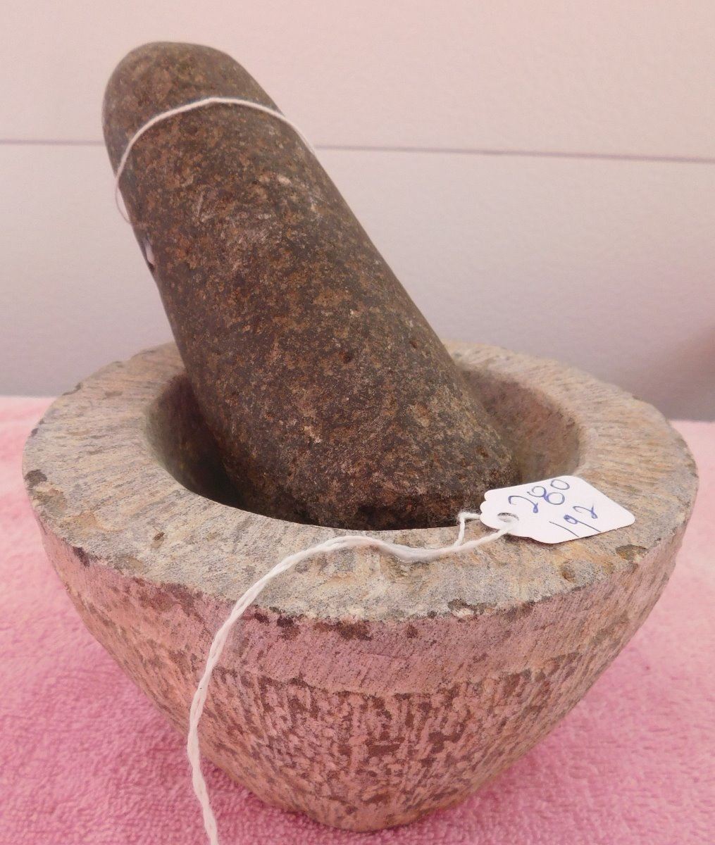 Chinese Mortar & Pestle, Ming Dynasty item. Made of basalt, the mortar measures 6" x 6" x 3" and the pestle is 6" x 2.5". Central China. Nice mortar and pestle pair. Condition: Good, see images. Shipping: $22.50 USA estimate only, w/insurance and signature, due to weight.