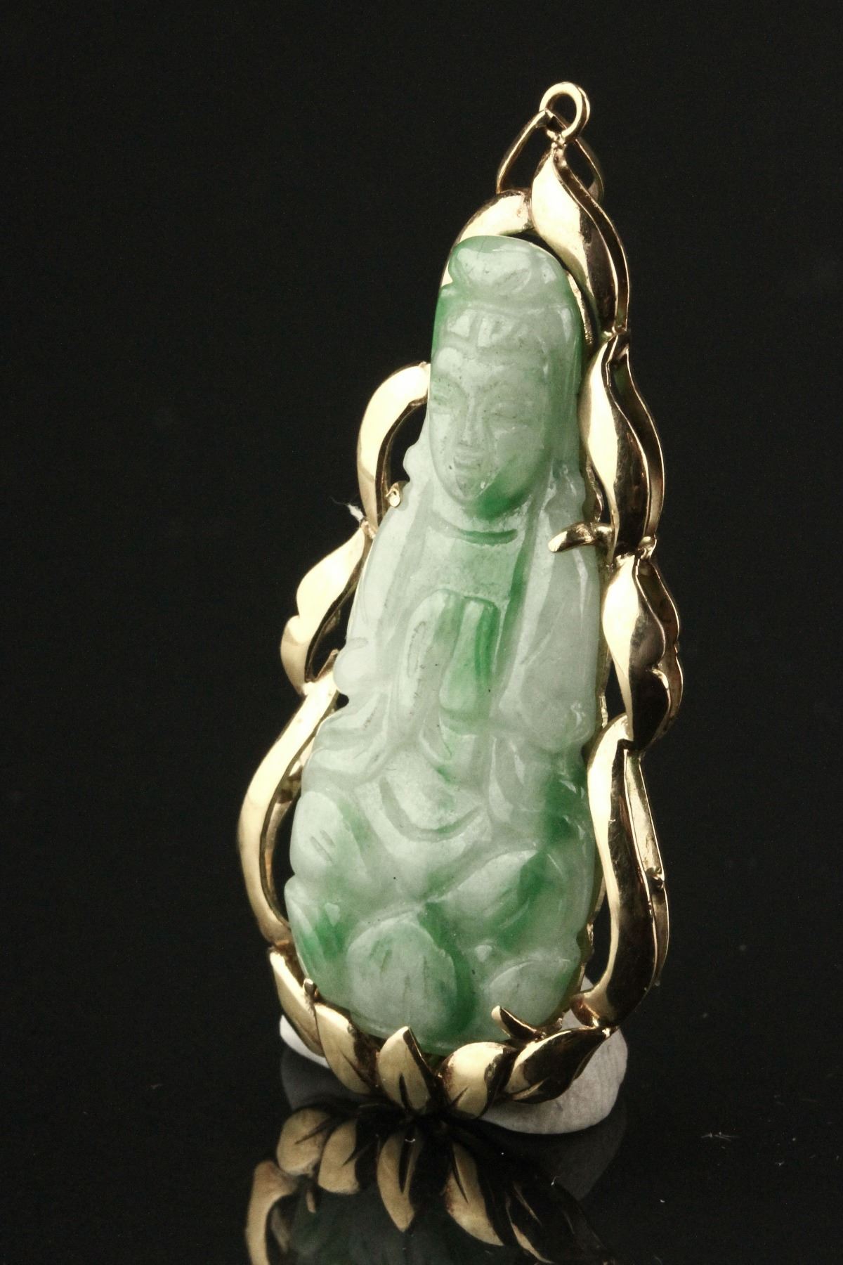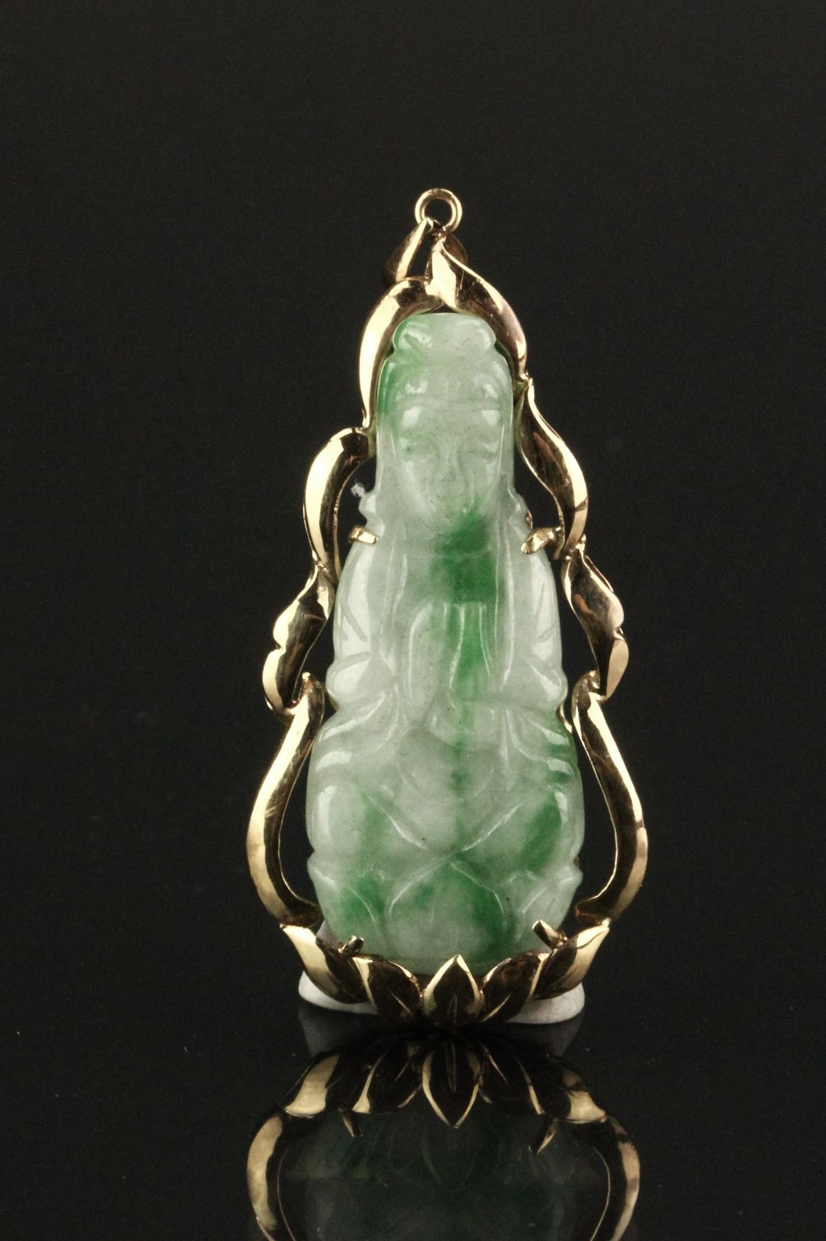 Chinese jadeite carved 14k gold pendant; featuring Guanyin in relief; Moss in Snow white with green suffusions; H: 4.3 cm, W: 1.4 cm, 6 grams