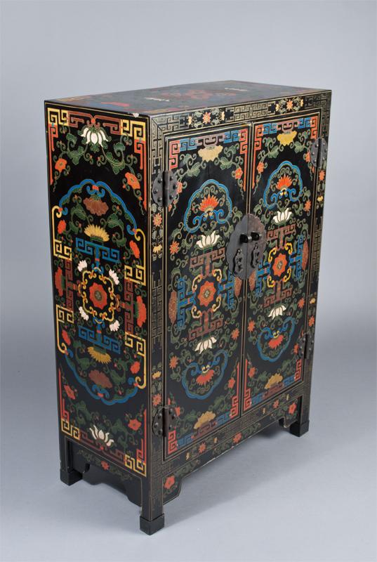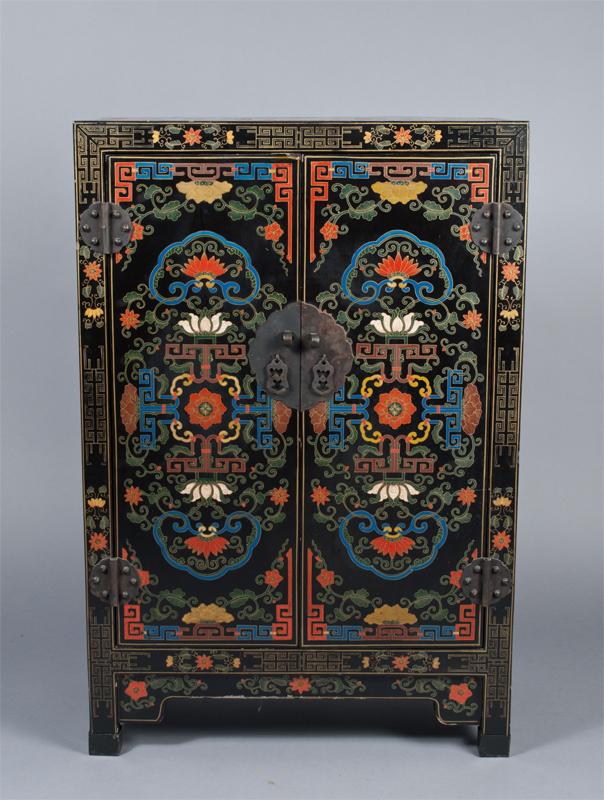 Two doors opening to a shelved interior, profusely decorated with flowers and symbolic shapes, in seven different colors, fitted with brass hardware. 36" H x 24" W x 12" D.