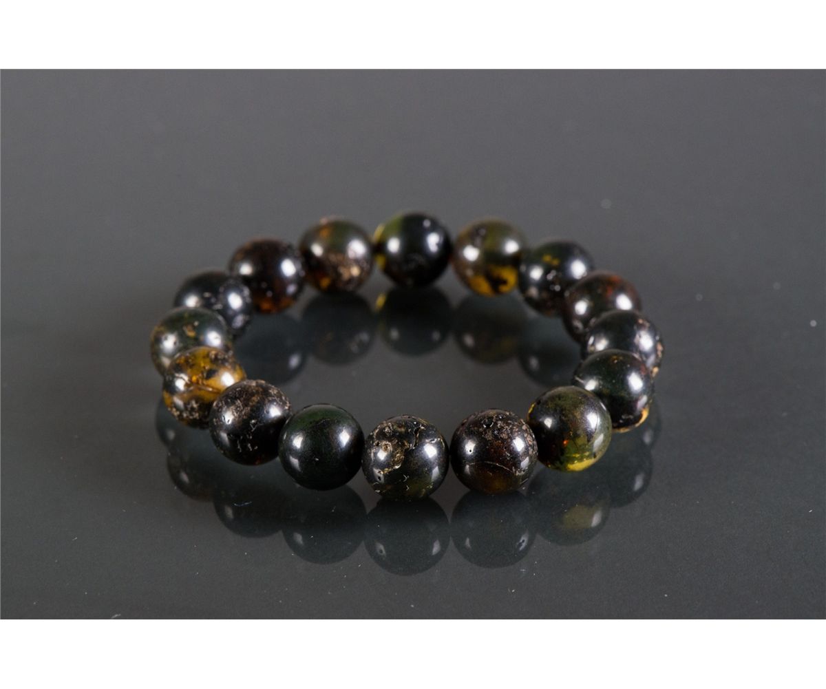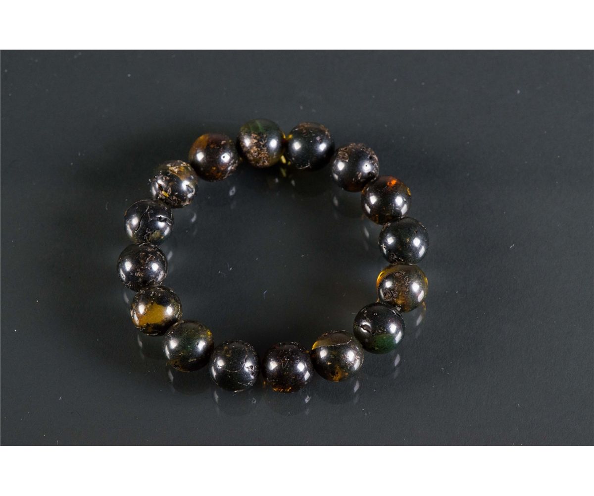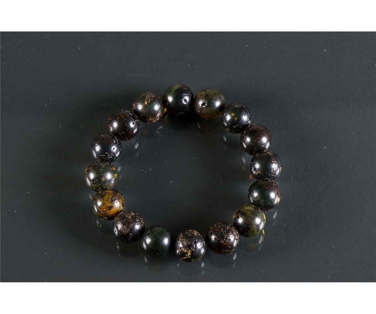 Chinese natural amber bracelet; comprised of sixteen round amber beads; of dark brown tone; D: 7.5 cm, Bead D: 1 cm, 18 grams; Density ~ 1.03