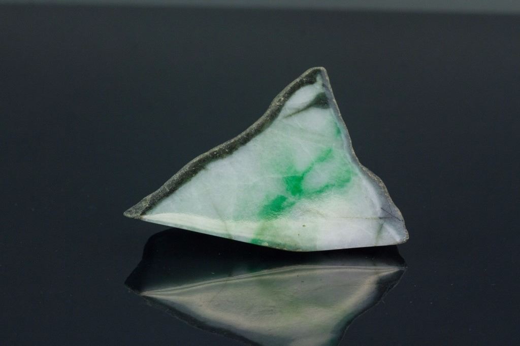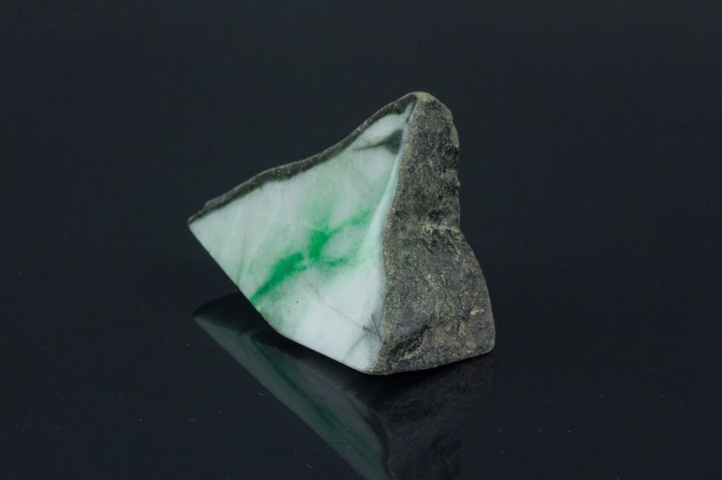 Natural jadeite uncarved boulder; of rough form; of white tone with apple green veins; one side with brown outer rough skin; H: 6 cm, W: 9.5 cm, 280 grams