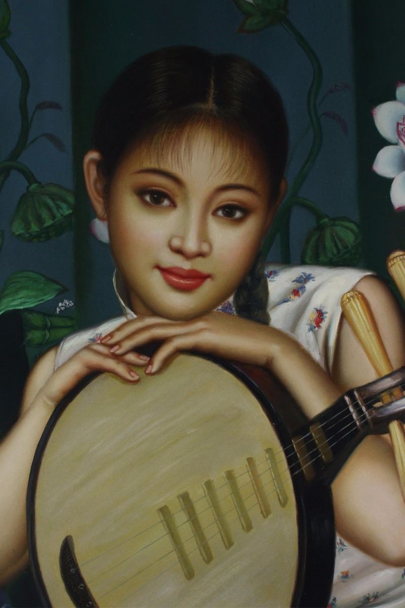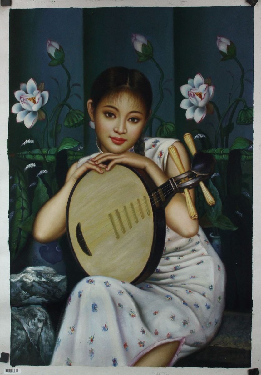 Young lady holds a Pipa; Chinese oil painting on canvas; 99 cm X 69 cm