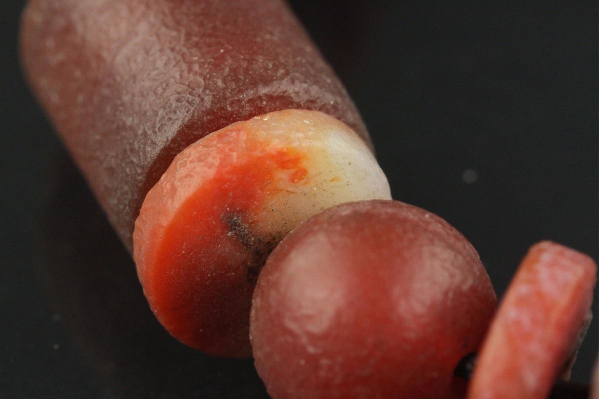 Chinese old agate carved necklace; comprised of barrel-shaped beads alternating with rounded and disk-shaped beads; L: 62 cm, D: 2.5 cm (per bead), 213 grams