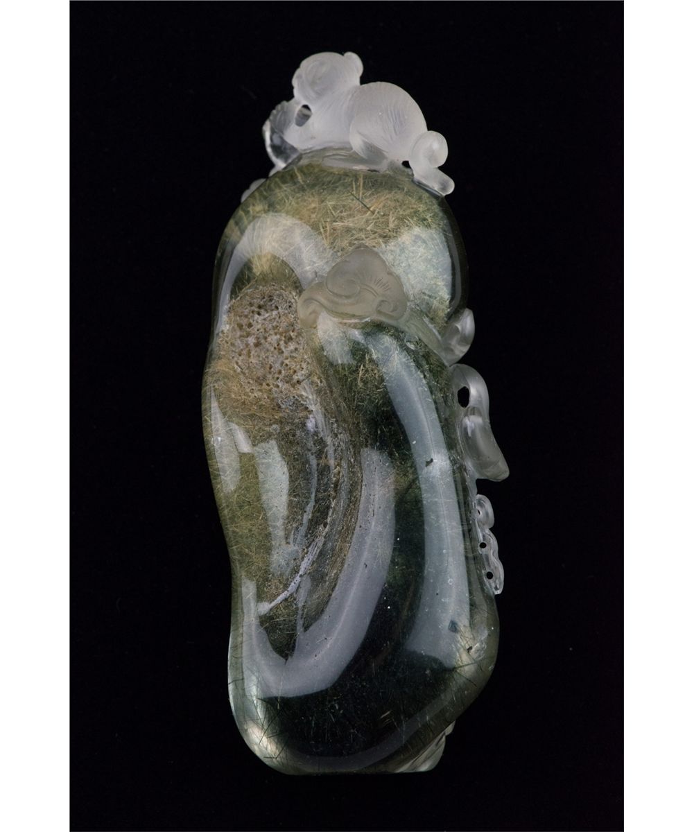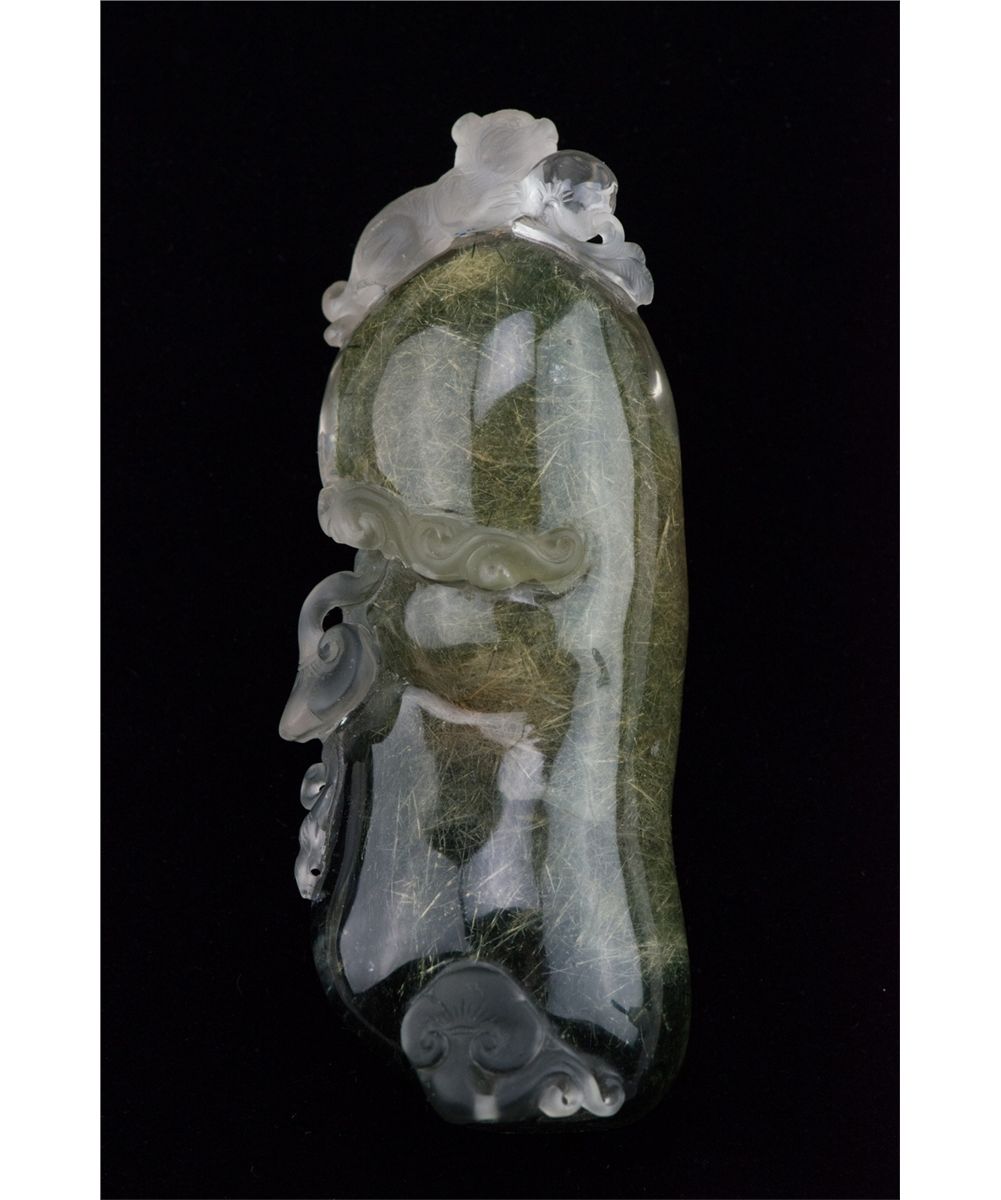 Old Chinese hair agate carved hand pendant, featuring tiger cub on fruit, the stone of high translucency, showing remarkable hair line structures, tiger cub and ruyi with frosted finish. H: 13.5 cm, W: 5 cm, 301 grams.
