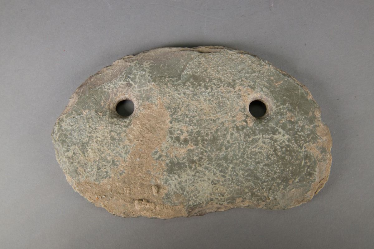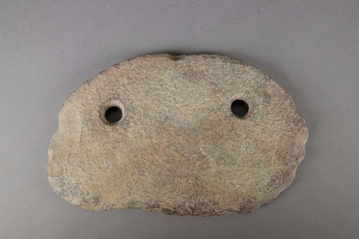 Old Archaistic Chinese carved stone axe ; of natural shape with thin edge; featuring two holes for suspension; H: 26 cm, W: 16 cm, 1557 grams