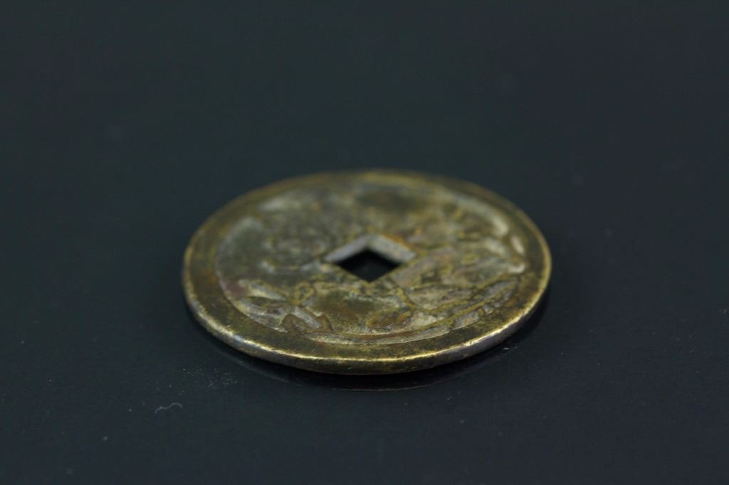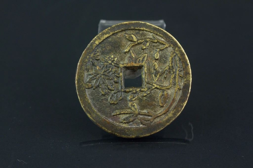 Chinese old bronze Yansheng patterned coin; with chrysanthemum spray on the obverse and script calligraphy on the reverse; Thickness: 0.2 cm, D: 4.8 cm, 21 grams