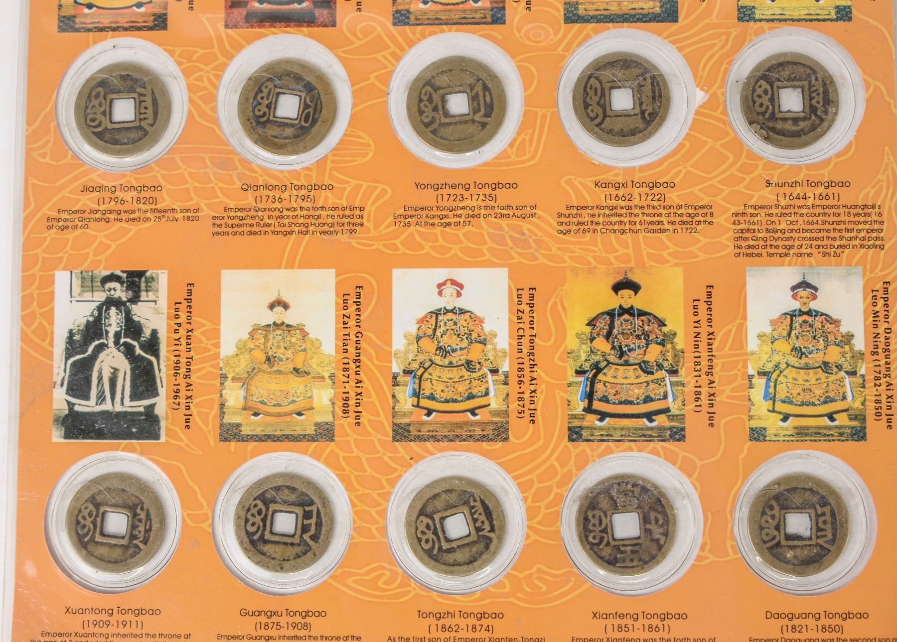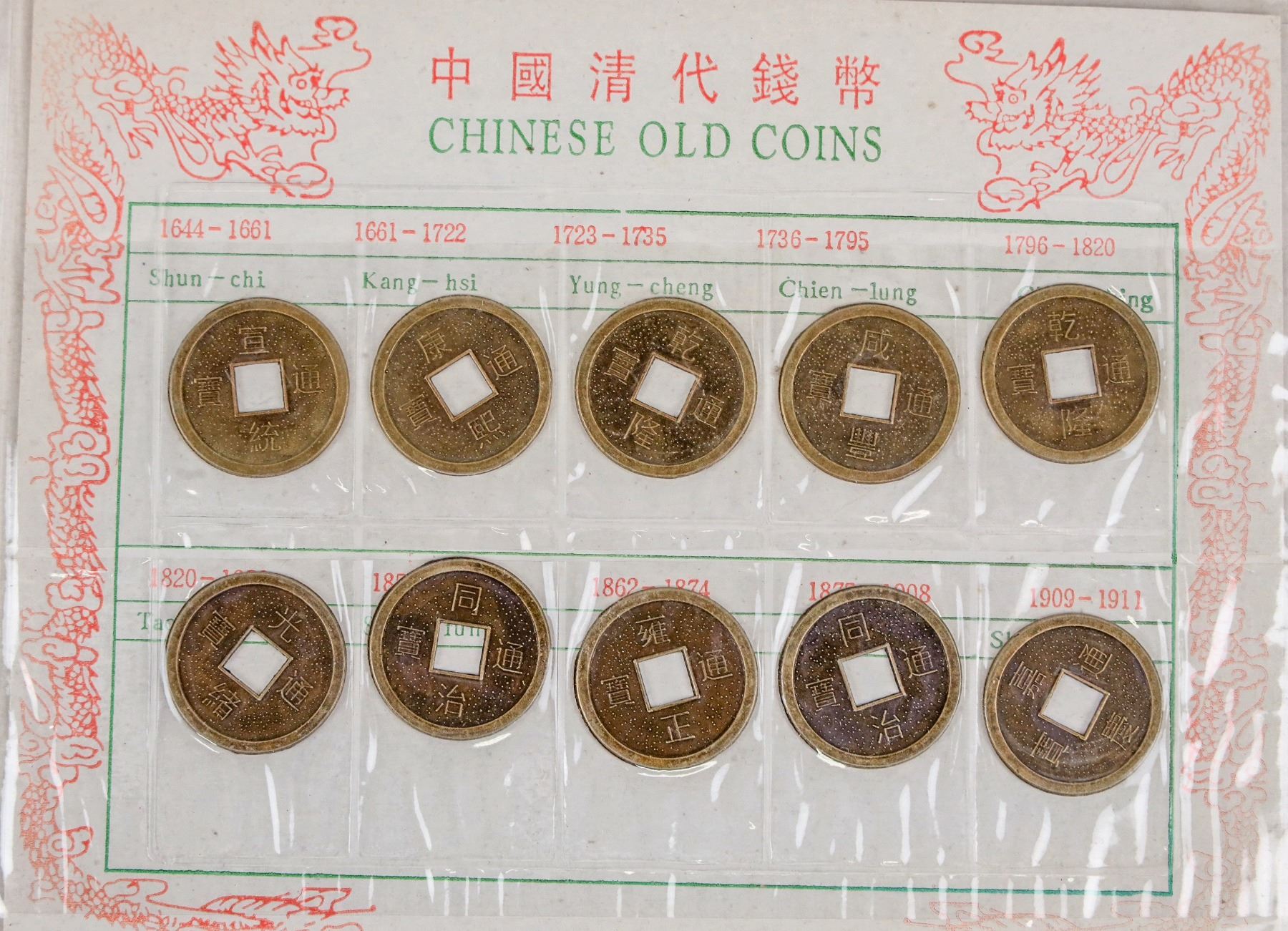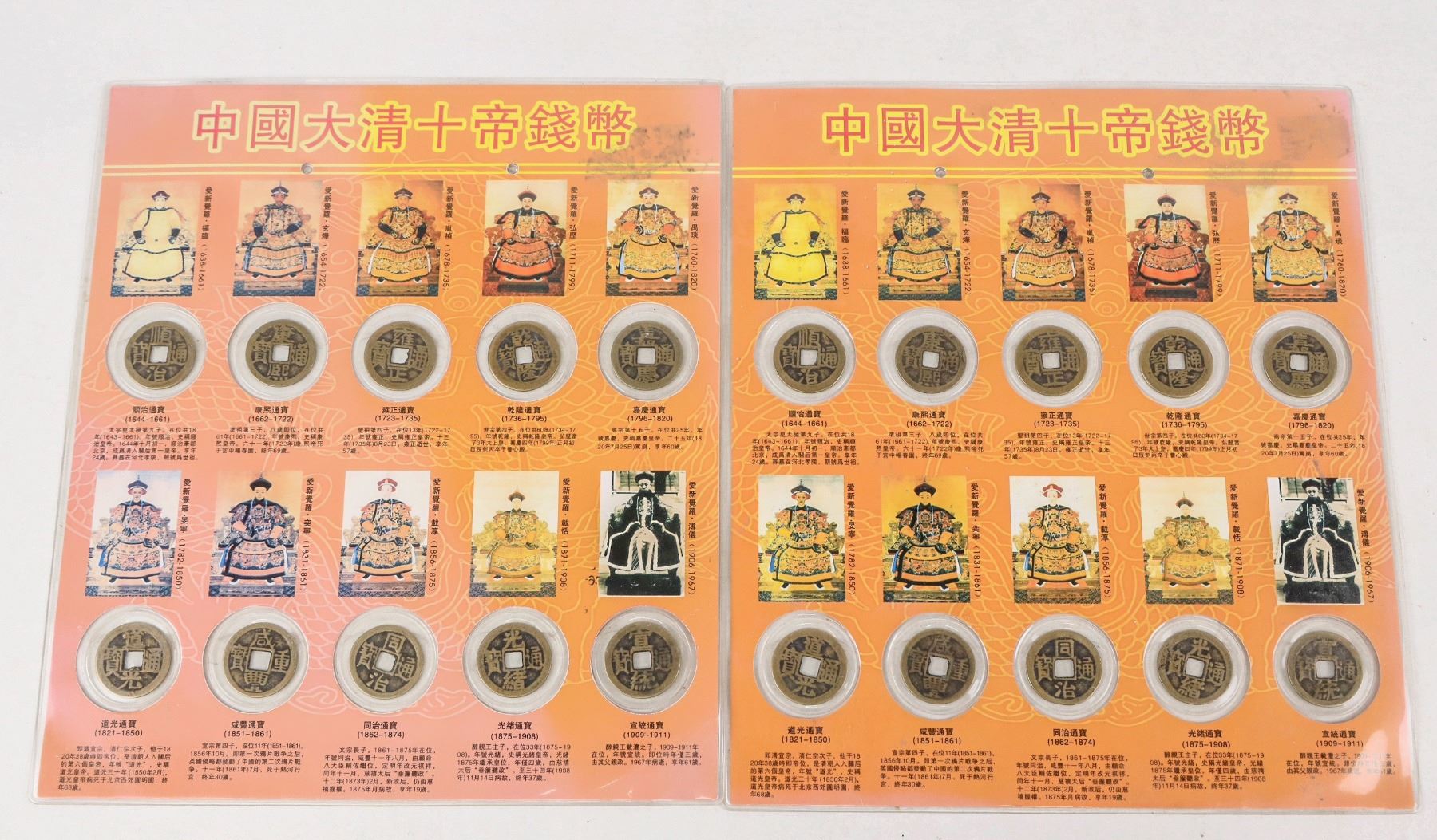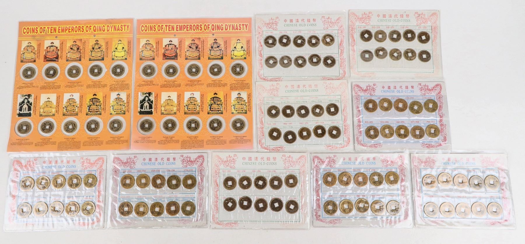Eleven sets of ten coins each of old Chinese coins: two are 8 x 10 colorful presentations of "Coins of Ten Emperors of Qing Dynasty" with illustrations of the Emperors. Nine are 7 x 5 inch cardboards with dates printed above the coins.
