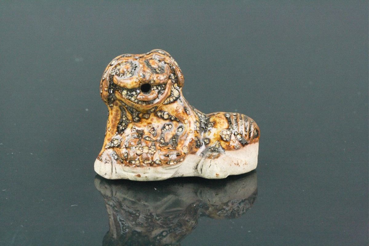 Chinese pottery water dropper; featuring dog in recumbent pose; covered in brown glaze; H: 4 cm, W: 7 cm, 78 grams