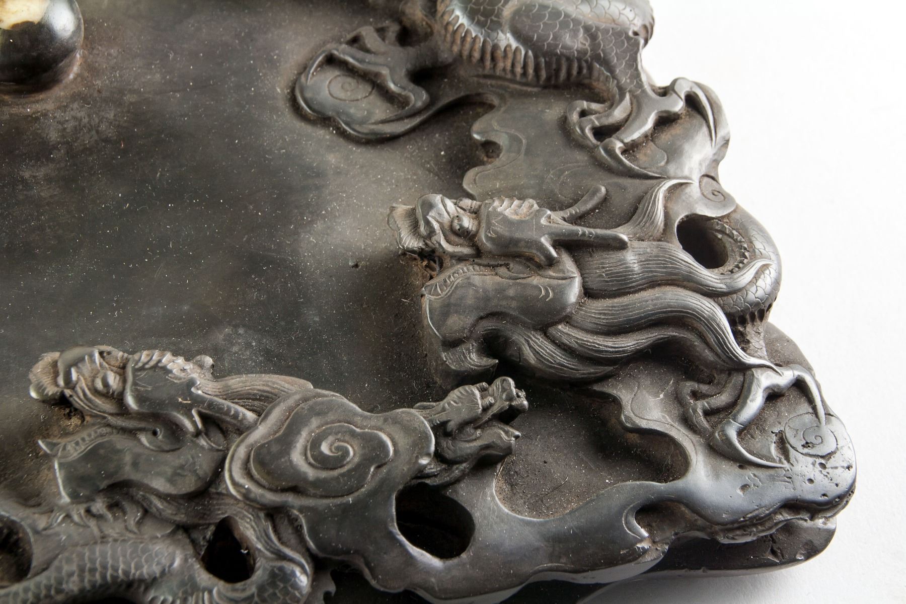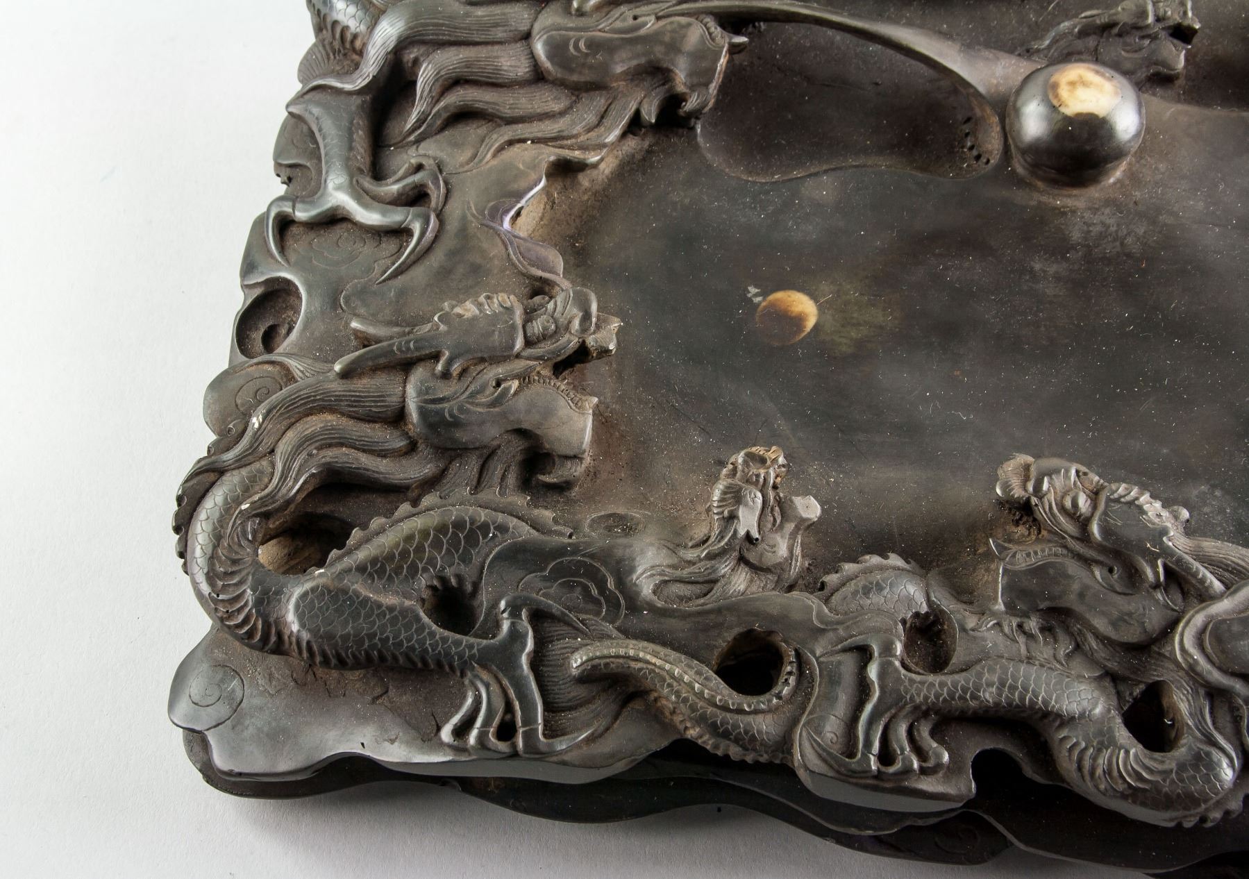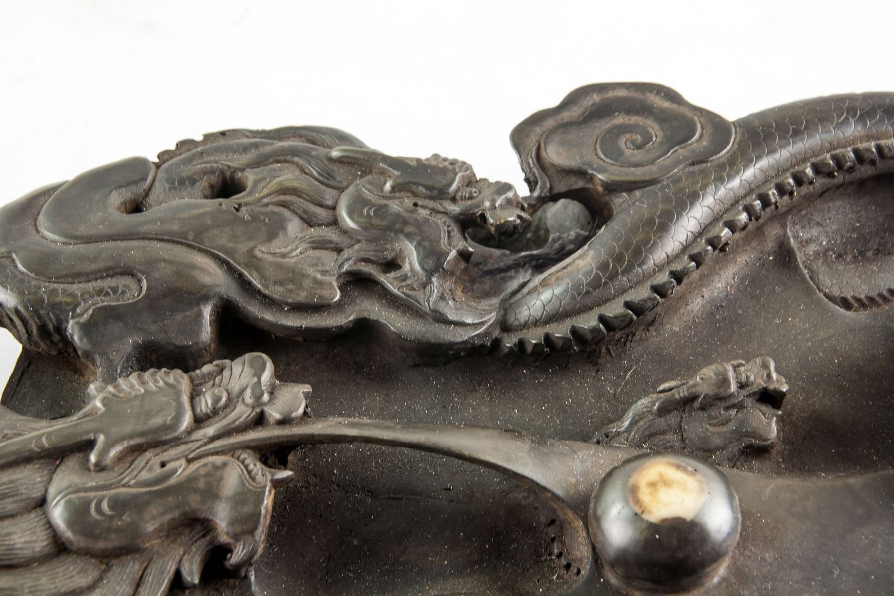 Chinese old ink stone, carved with open wok dragons and ball, four-character mark on base, 29 x 24 cm