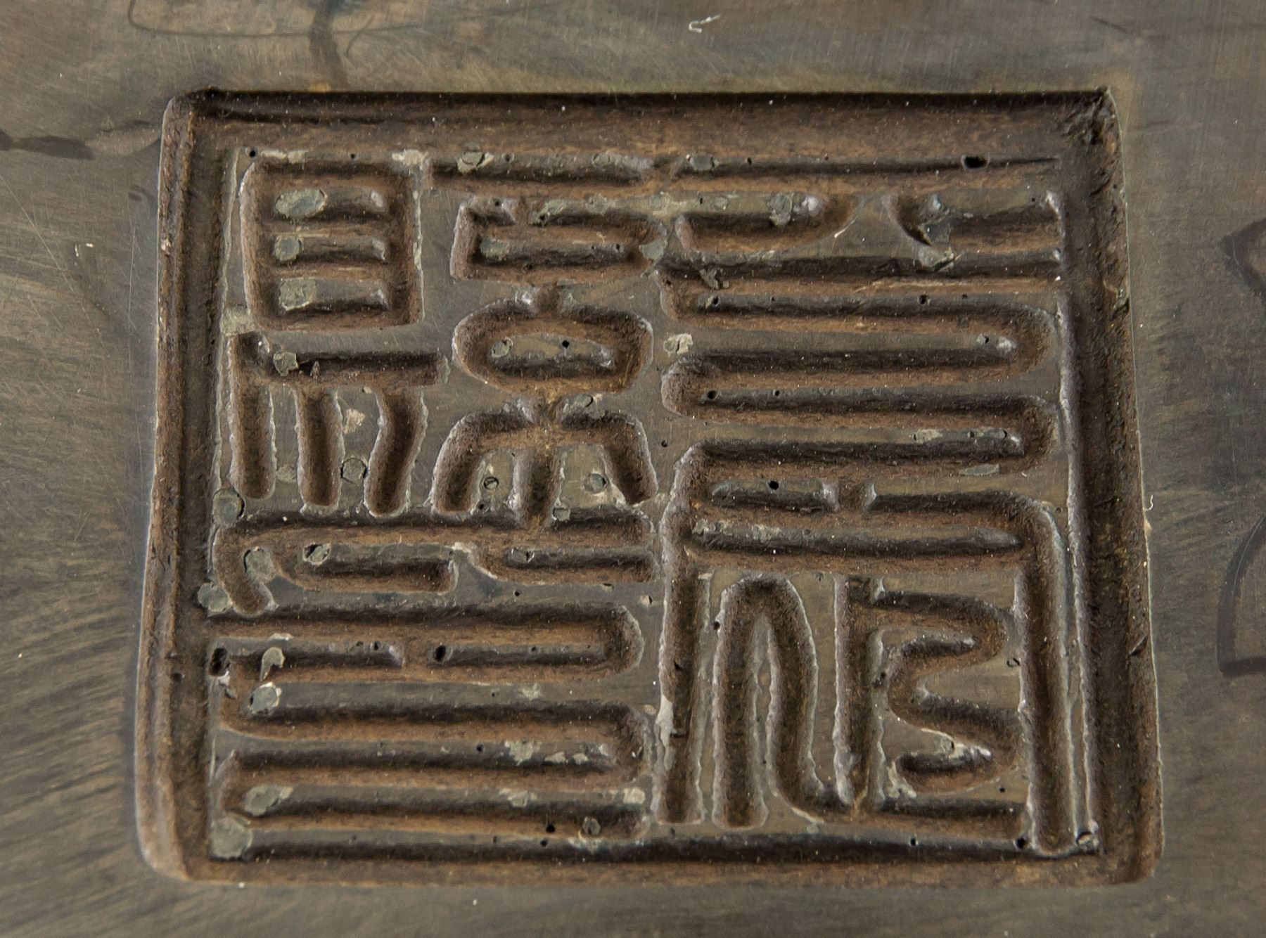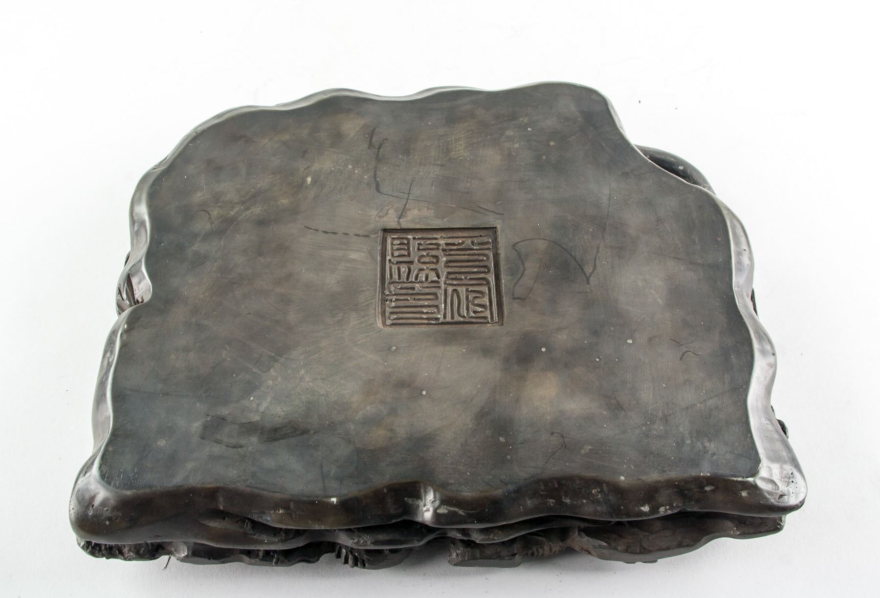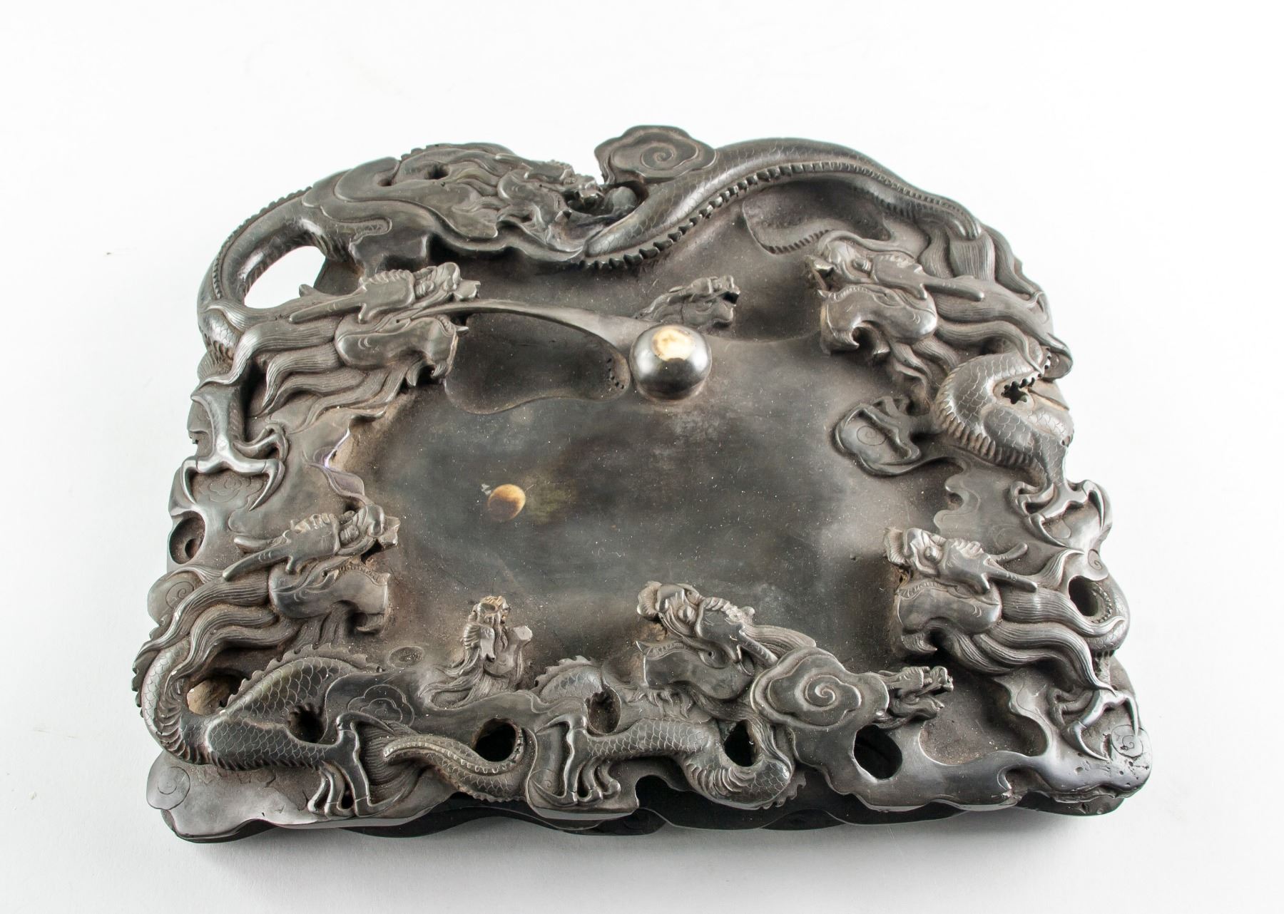Chinese old ink stone, carved with open wok dragons and ball, four-character mark on base, 29 x 24 cm