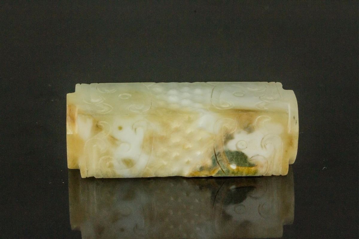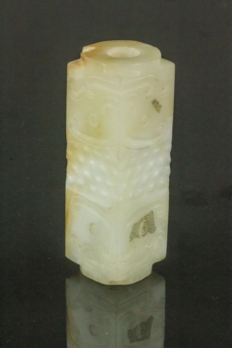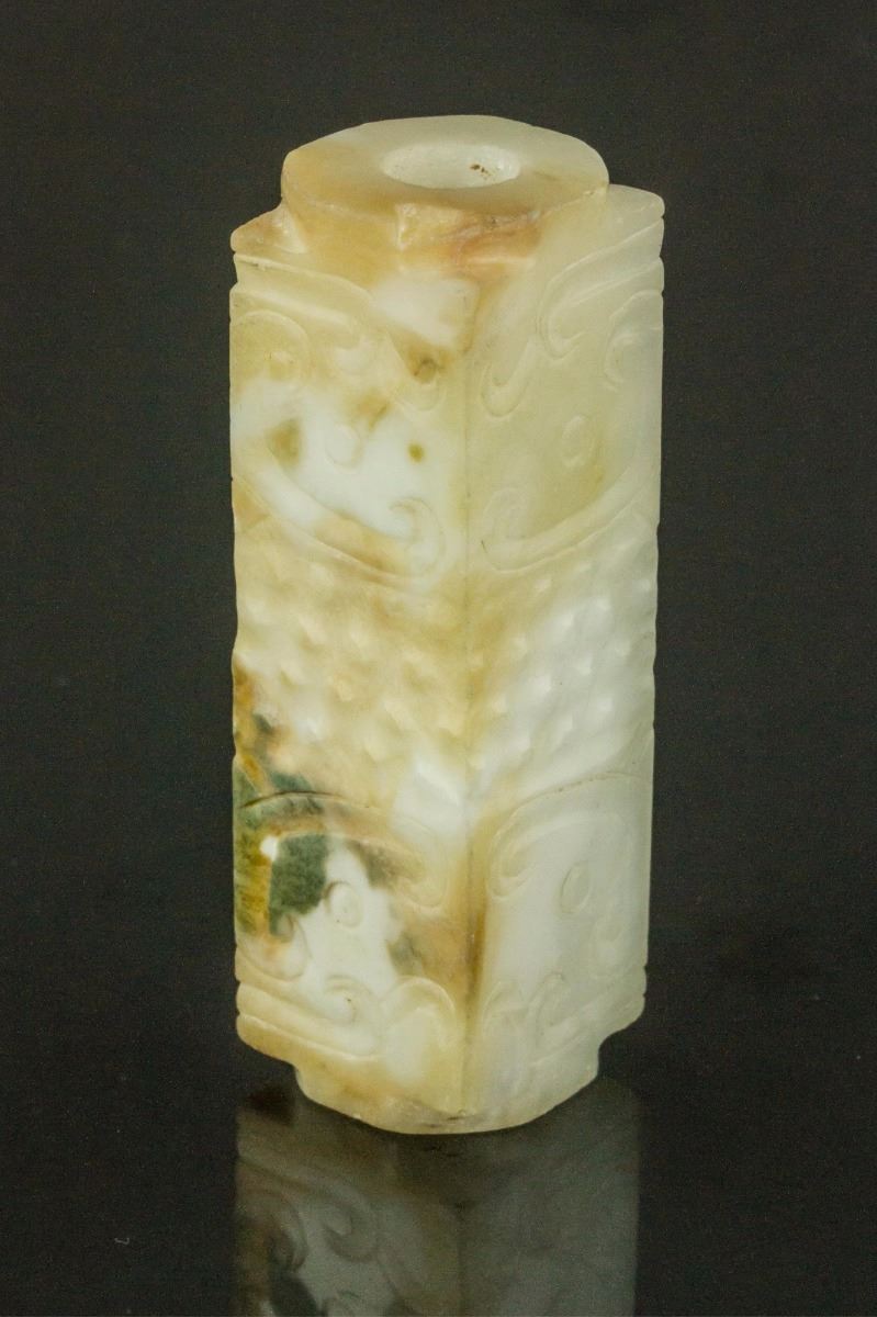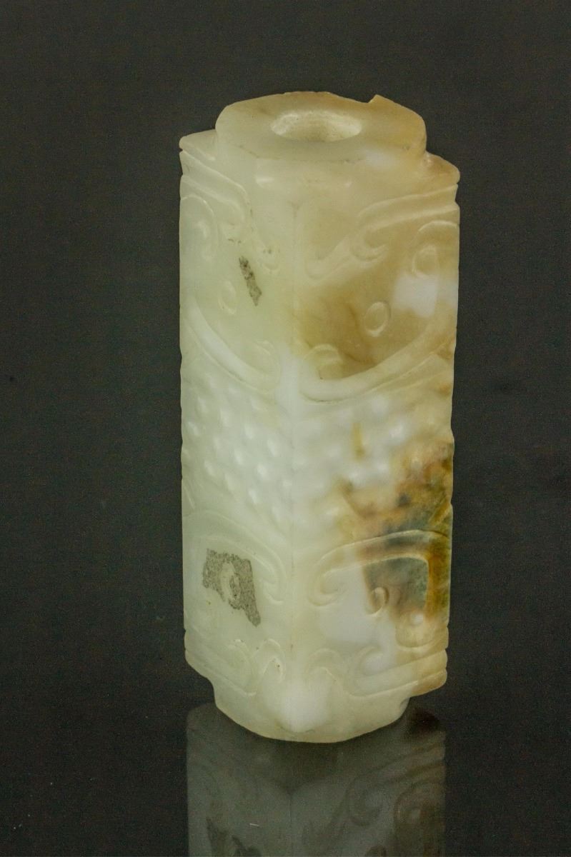 Chinese archaic jade pendant; of Cong vessel form with archaistic carvings in low relief; the body of opaque calcification with russet and spinach green suffusions; H: 6.5 cm, W: 2 cm, 62 grams,Density: 2.93