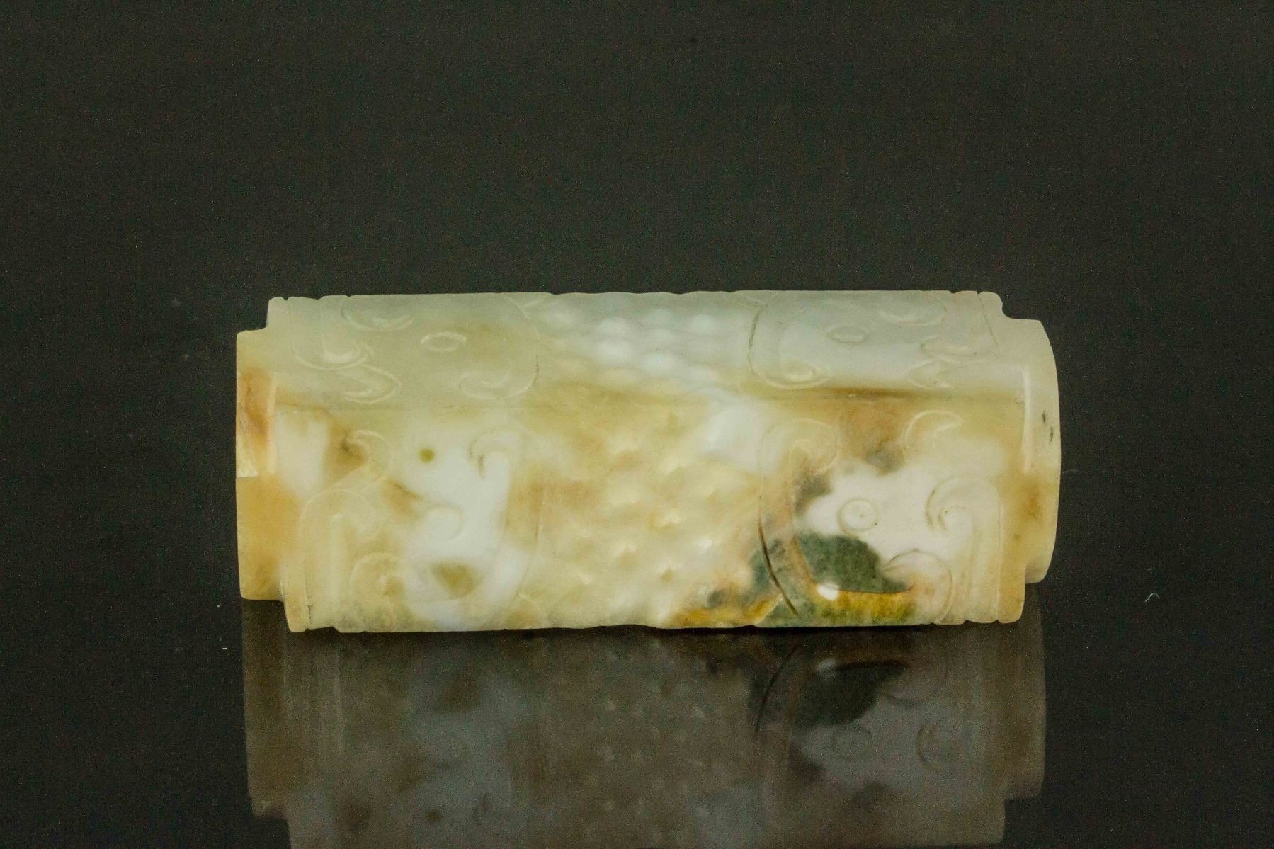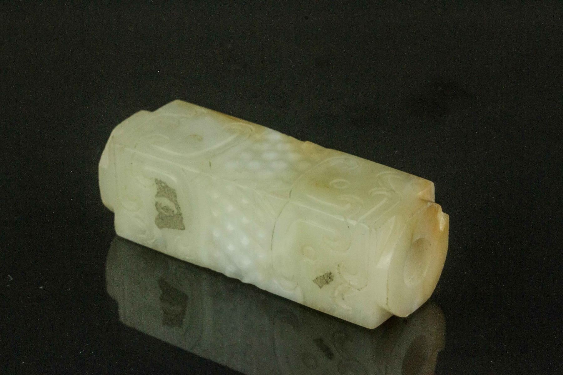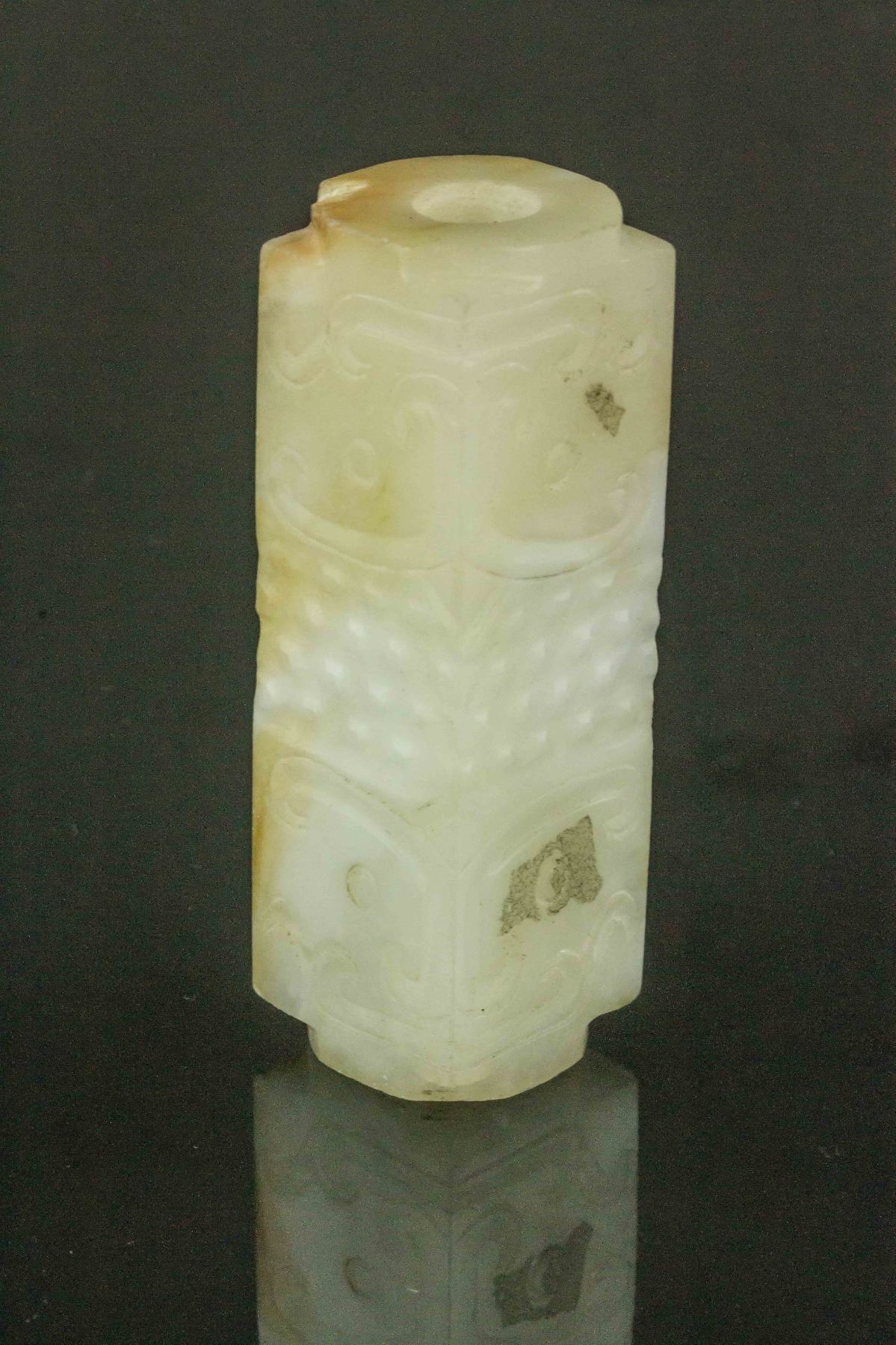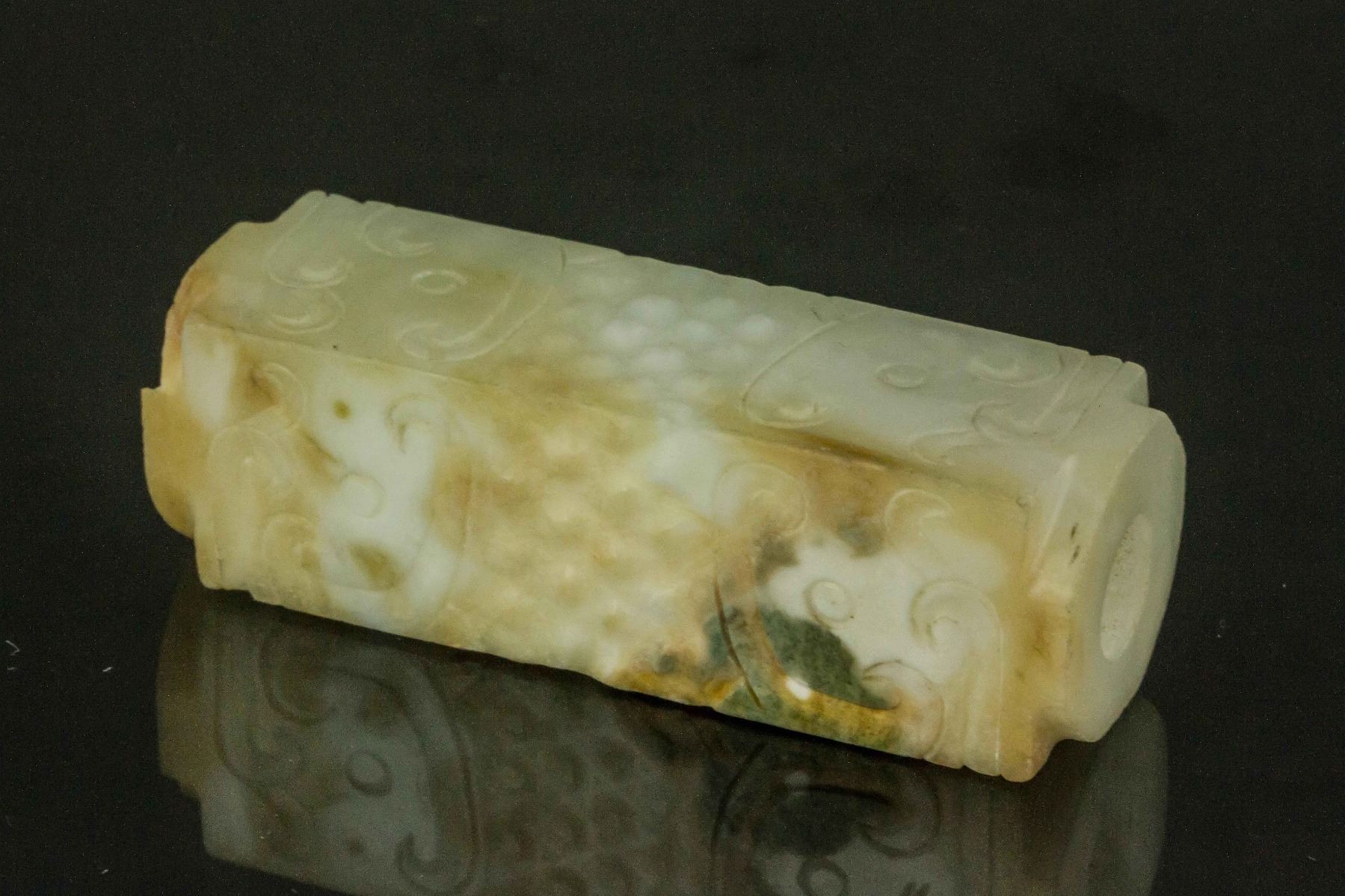 Chinese archaic jade pendant; of Cong vessel form with archaistic carvings in low relief; the body of opaque calcification with russet and spinach green suffusions; H: 6.5 cm, W: 2 cm, 62 grams,Density: 2.93