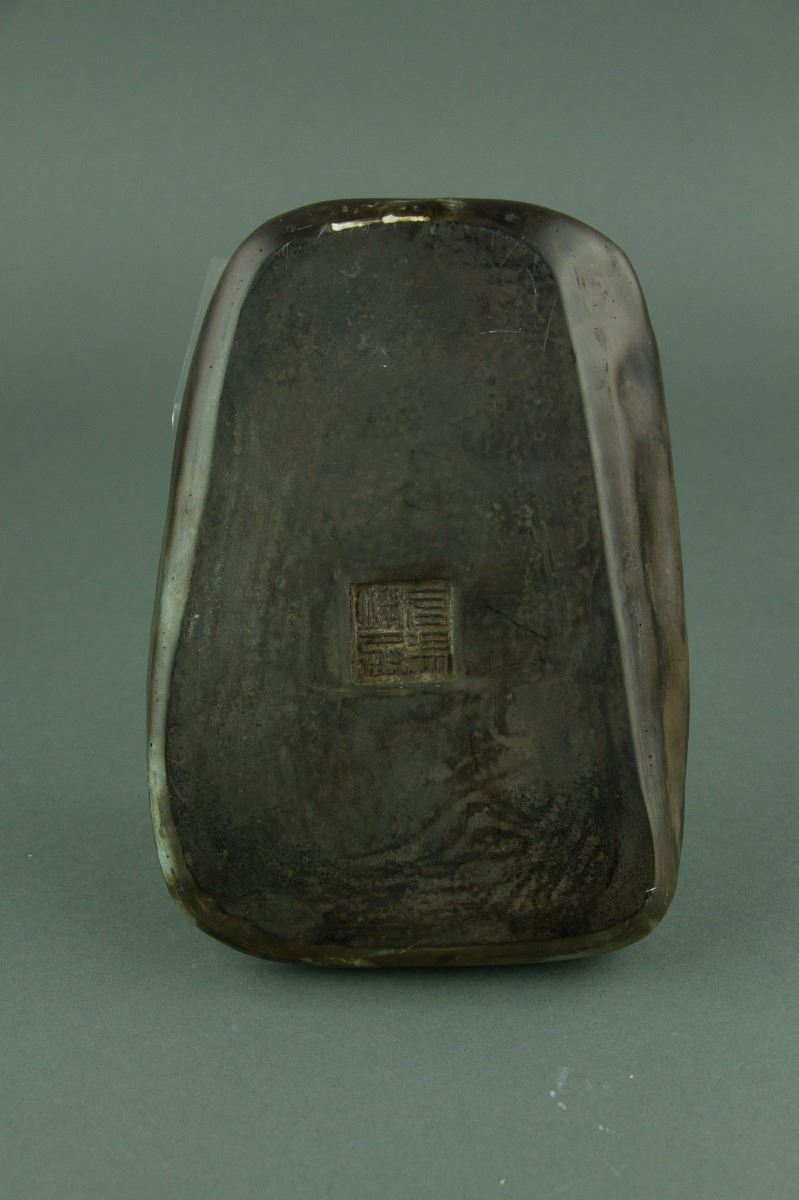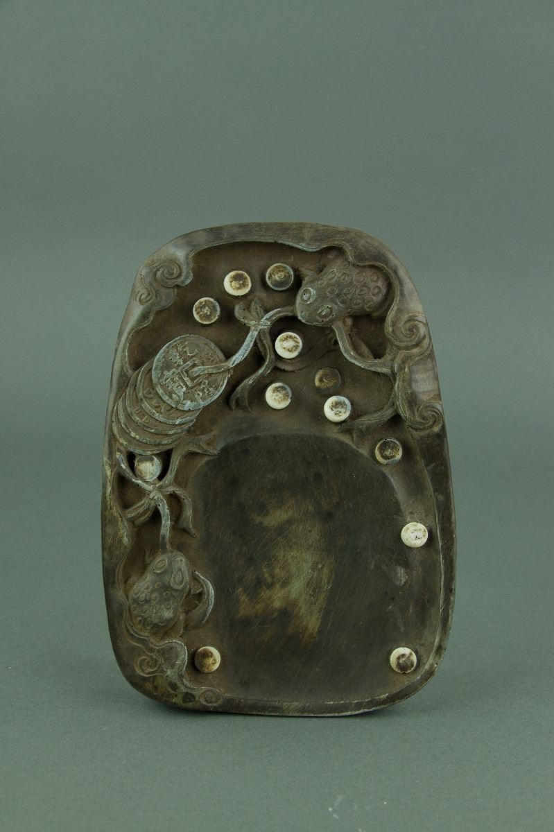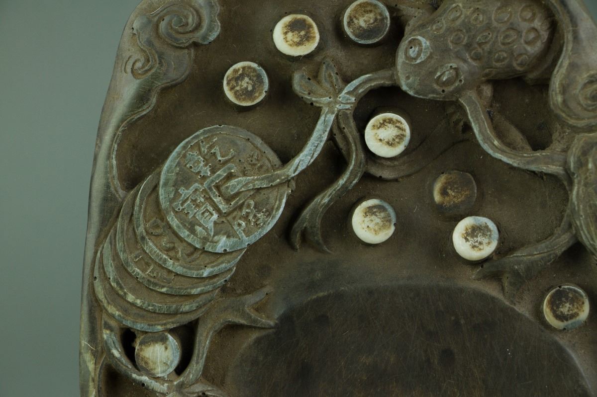 Chinese old ink stone; of flatten ovoid section; decorated with frogs and a string of cash coins in low relief; four-character seal mark on base; W: 13 cm, L: 19.5 cm, 1195 grams