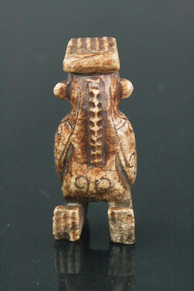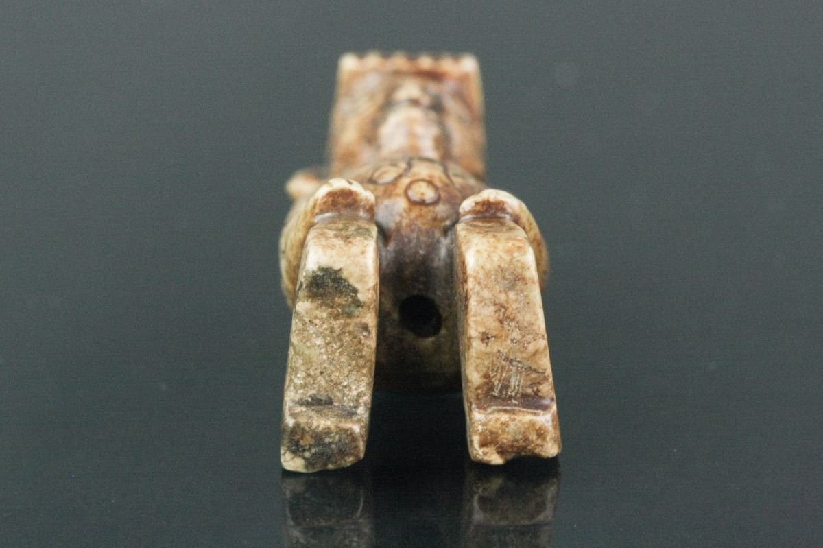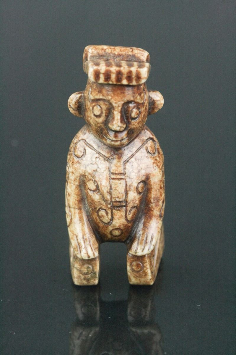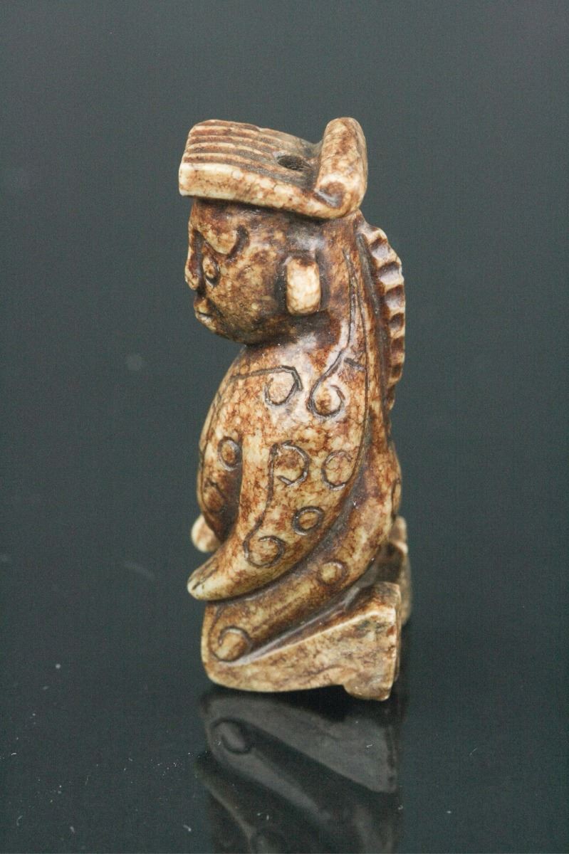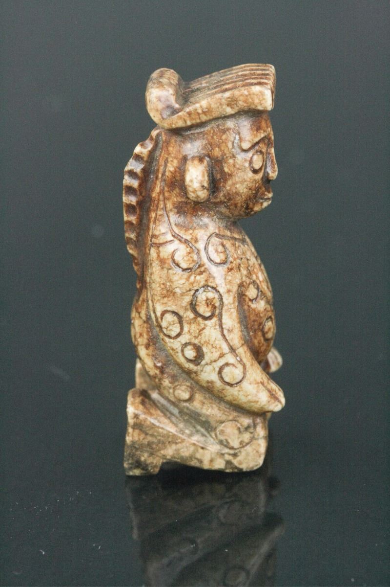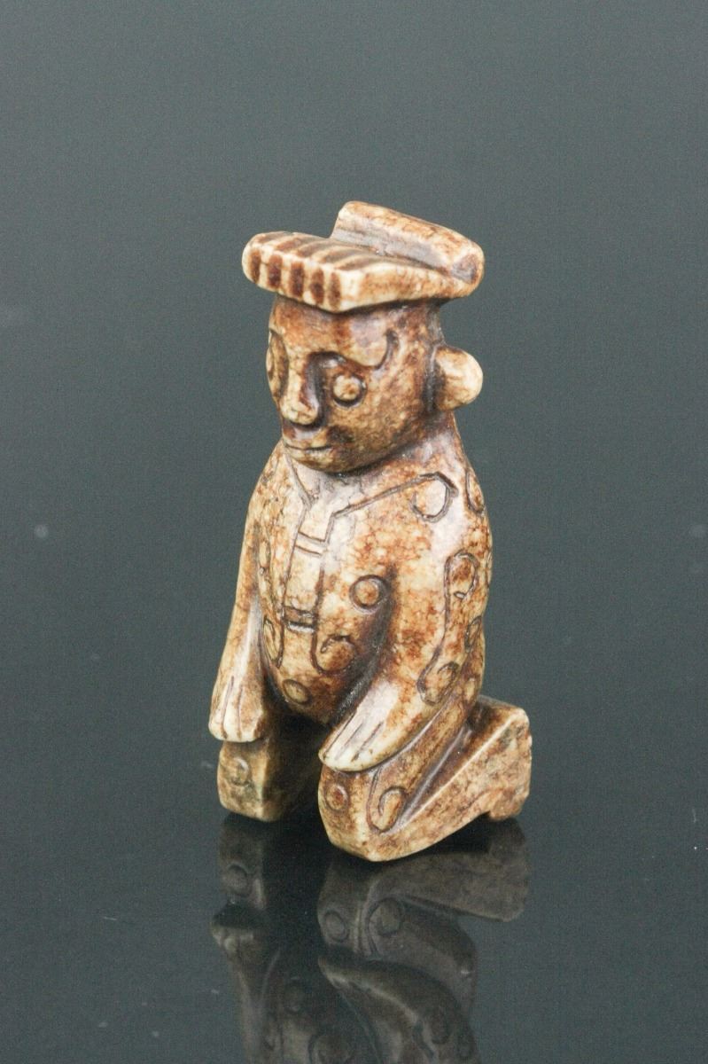 Chinese archaistic jade carved figure; featuring a kneeing man; of white tone with russet suffusions; H: 5.5 cm, W: 2 cm, 38 grams; Density: 2.83