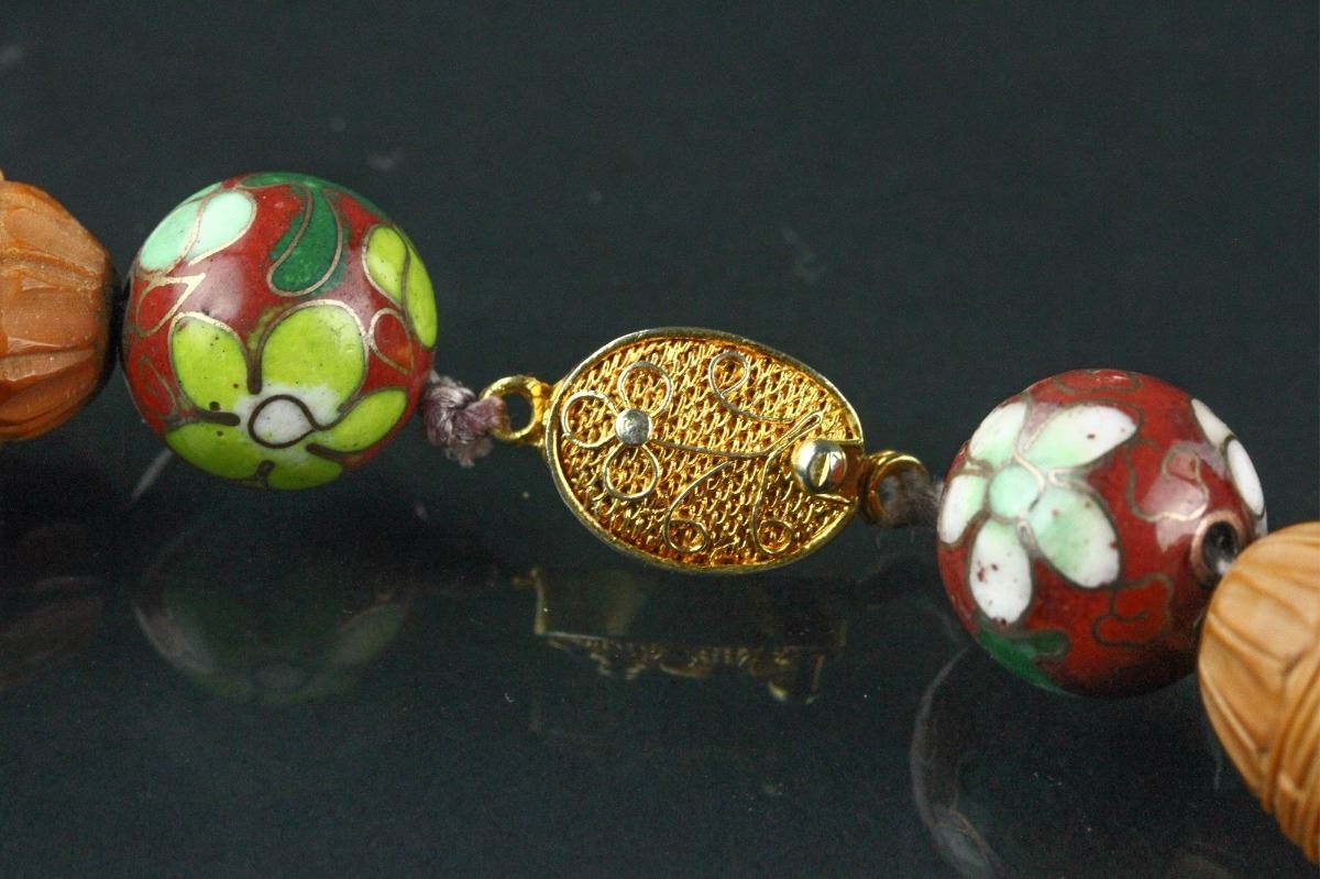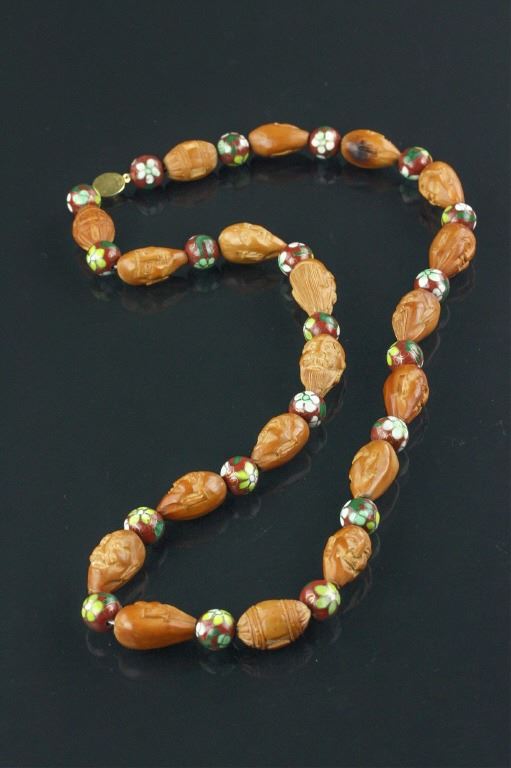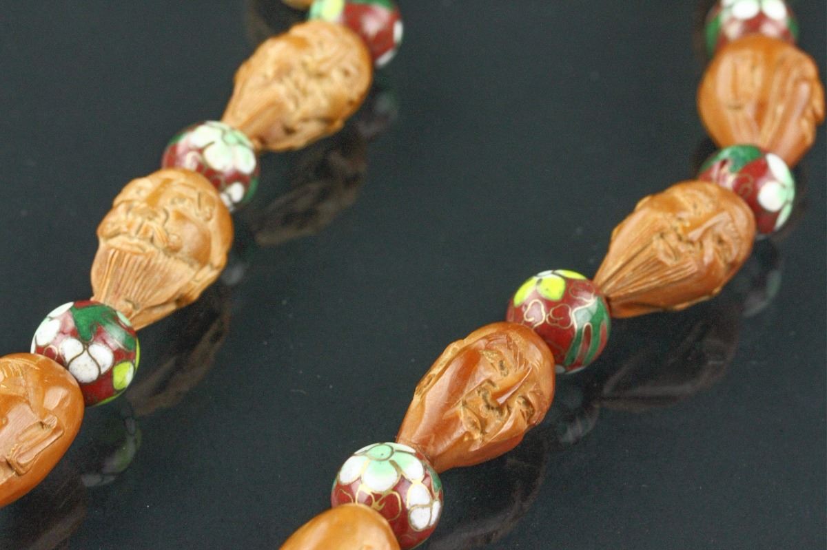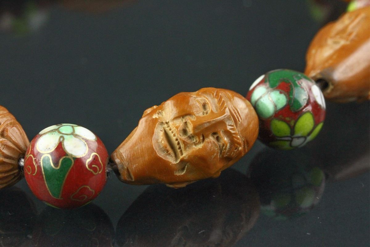 Chinese old nut beads necklace; comprised of nineteen carved beads with head of immortals; alternating with rounded cloisonne beads; D: 36 cm, 121 grams
