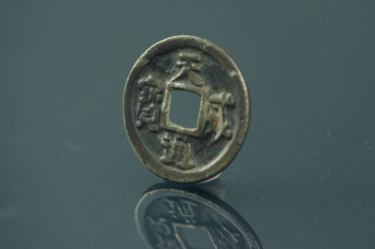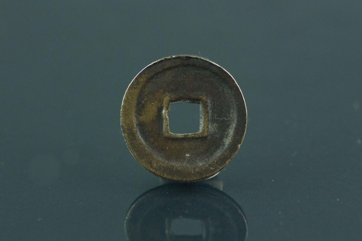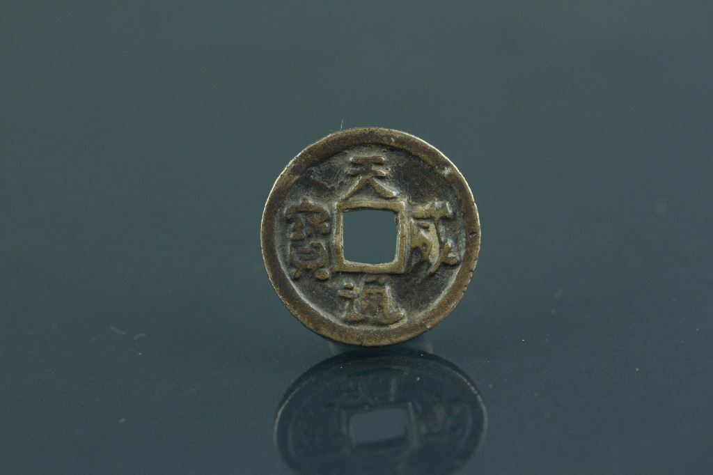 Chinese old silver coin; of circular form with square hole; four-character Tian Wei Tong Bao on the obverse side; D: 2.3 cm, 4 grams