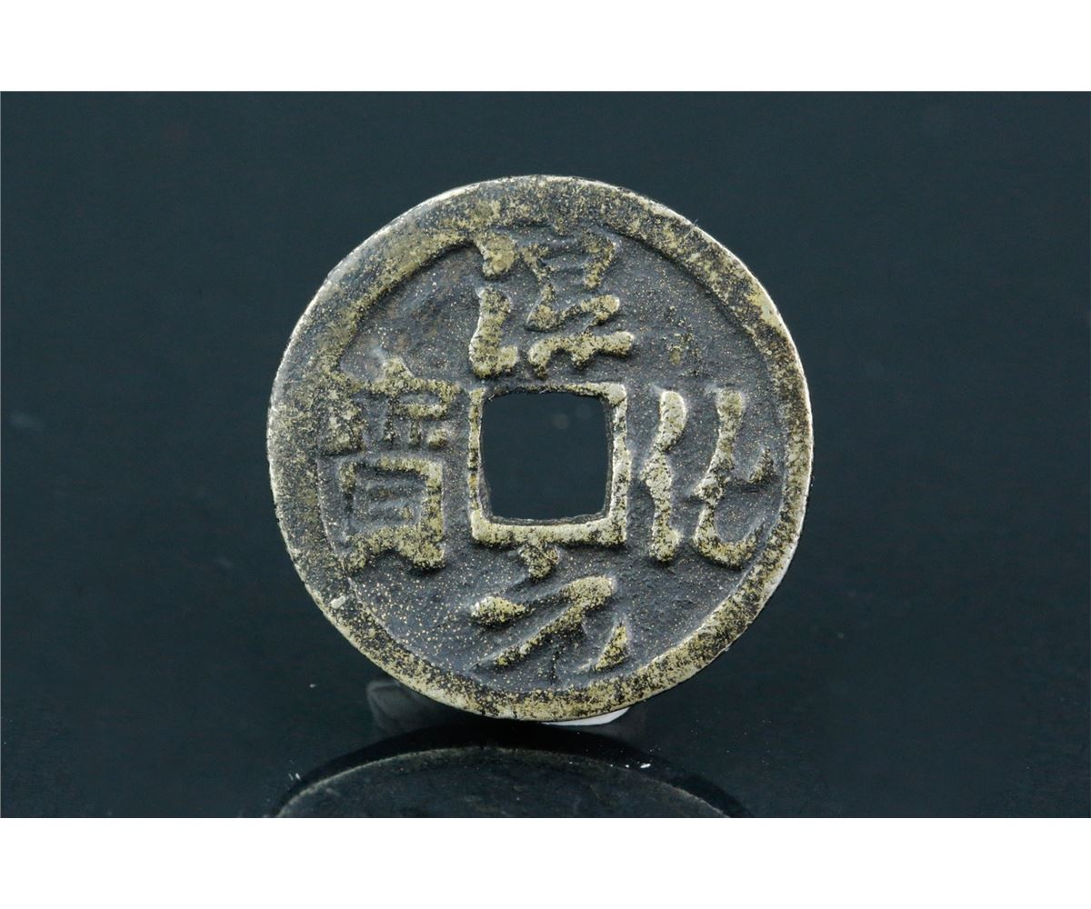 Chinese old silver coin; of circular form with square hole at centre; featuring two Guanyin in high relief on one side and four-character mark Chunhua Yuanbao on the other side; D: 20 mm, 4 grams; purity not tested