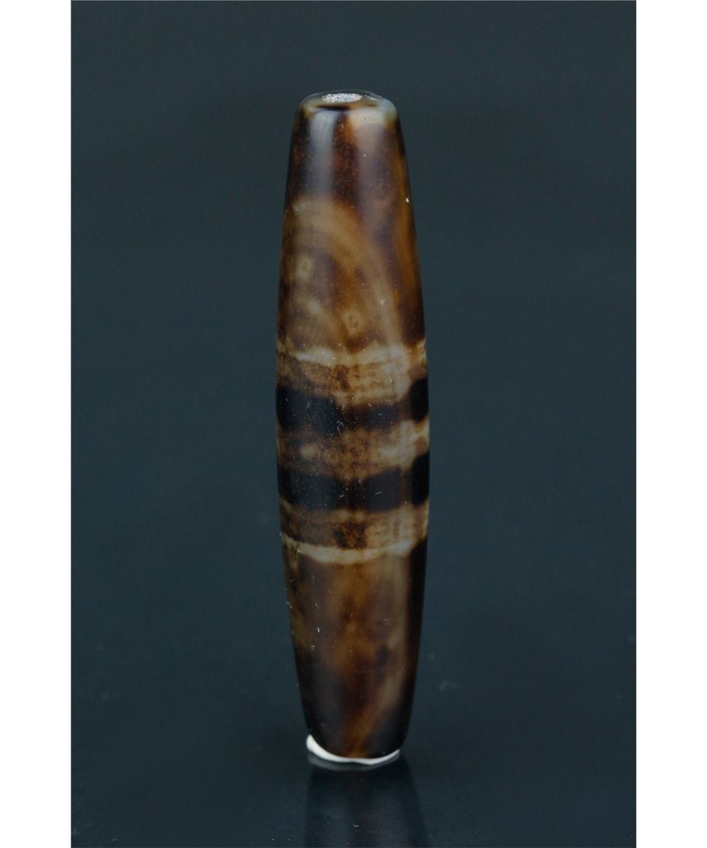 Chinese old tianzhu bead; of slender oval form; featuring three stripes on body; of dark brown tone; L: 55 mm, beads D: 1 cm, 11 grams