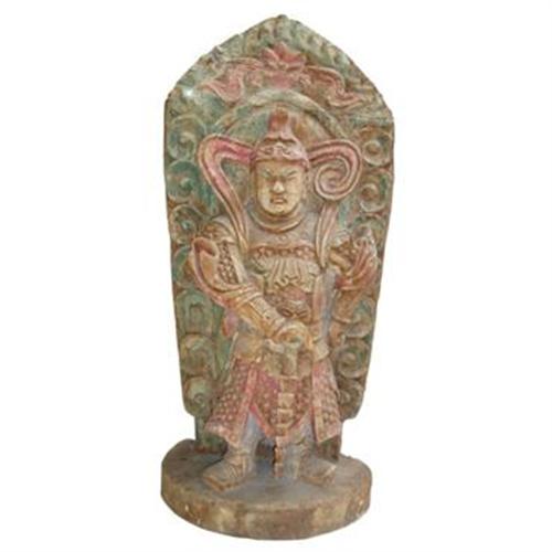 The antique is a piece of elaborate old Buddhist Guardian statue of wood carving standing on the platform from china.Beautiful pieces of of art and inspiration.Although passed many years,the colours in the surface had partially brushed off .But still it can be say as a masterpiece in chinese wood carvings.This statue is in excellent condition.I can find no chips, cracks, or other visible damage.I have tried to photograph the item accurately, and i have provided several close-up pictures below. This is an excellent specimen: a work of both artistic merit and spiritual value.This Buddha is a wonderful example of the skill and artistry of the Chinese woodcarvers.Guaranteed to be as described and shown.