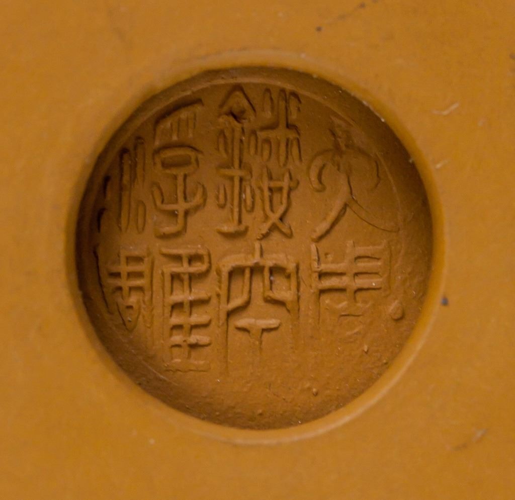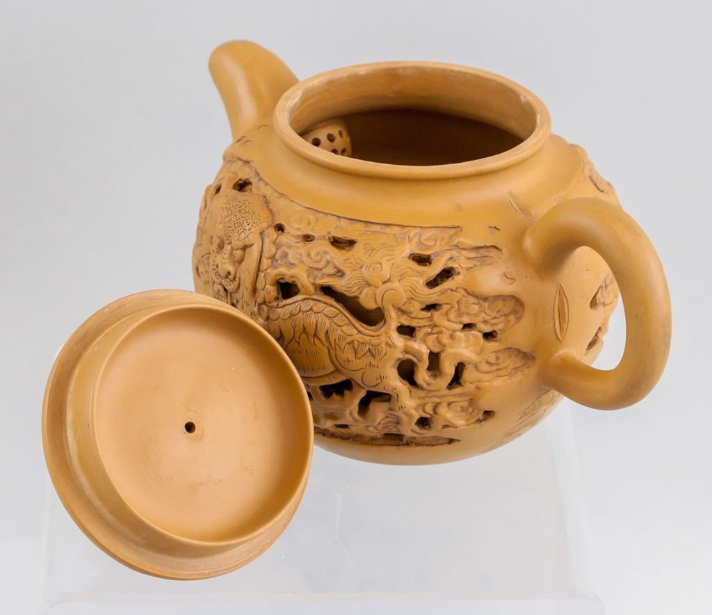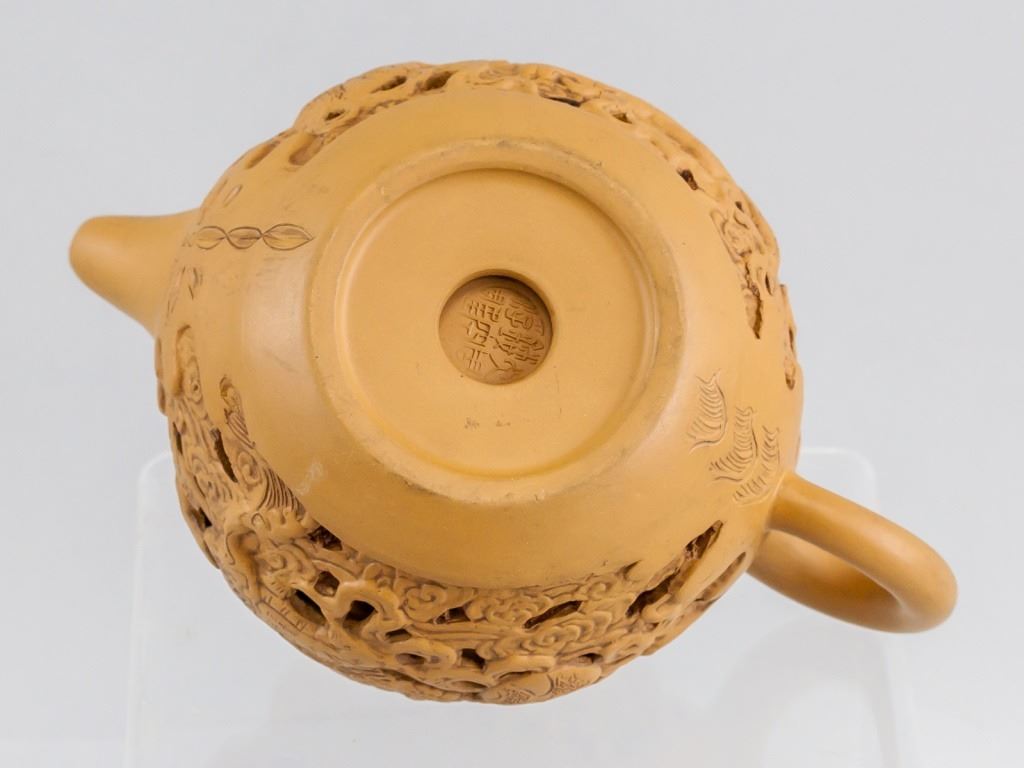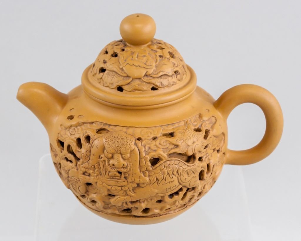Chinese teapot. Of orange-yellow tone. Carved with openwork, featuring dragon. Seal mark on base. 15 x 13 cm. 430 grams.