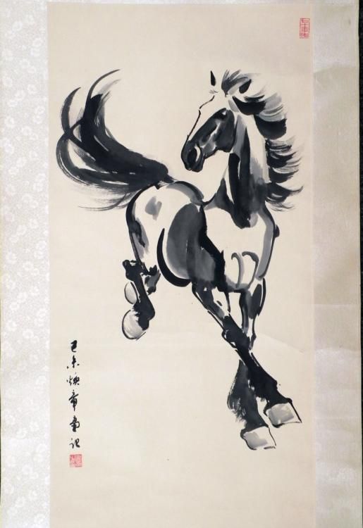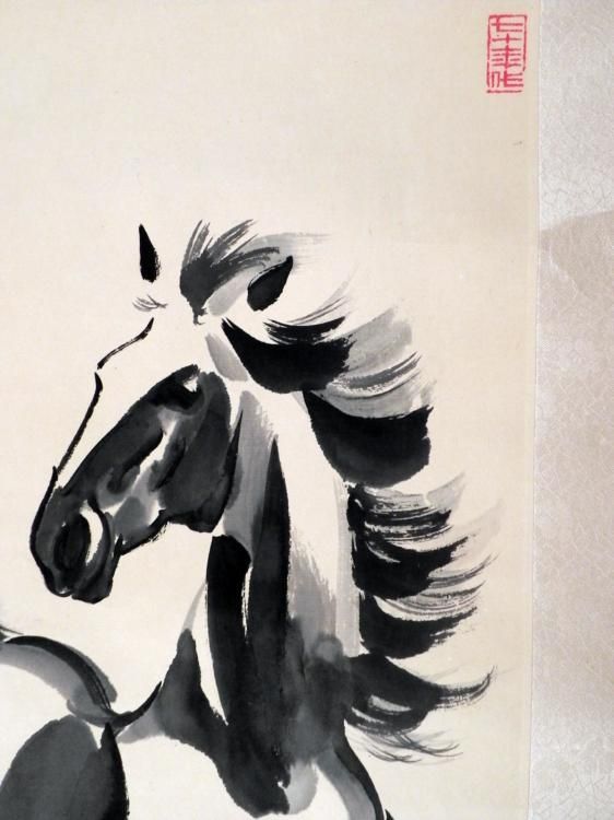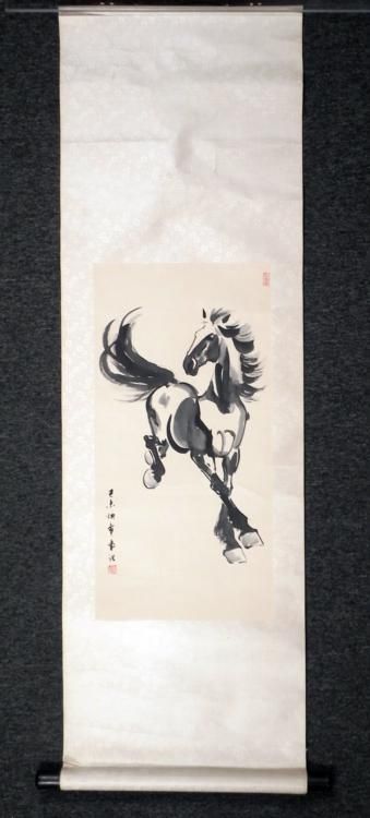 This Chinese scroll has an original painting of a horse. The painting is done with black watercolor on paper, signed at the lower left, with red character stamps. The scroll has a silk sheen floral pattern, with black wooded rod at the bottom, and string at the top. The verso has a signed strip of applied paper. The paper size is 13 x 26 inches. The overall size of the scroll is 18 x 57 inches. The condition is very good, aside from some tearing at the top rod, and minor wrinkling overall. * This is a fine scroll with a nicely painted horse.
