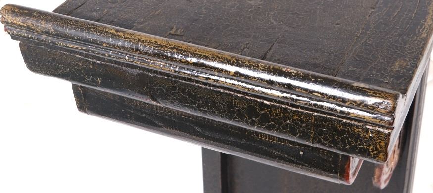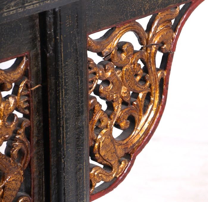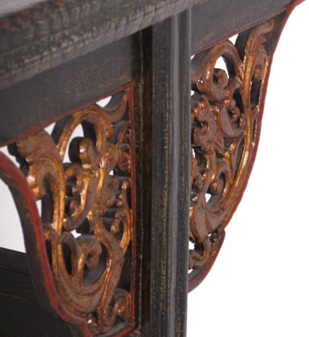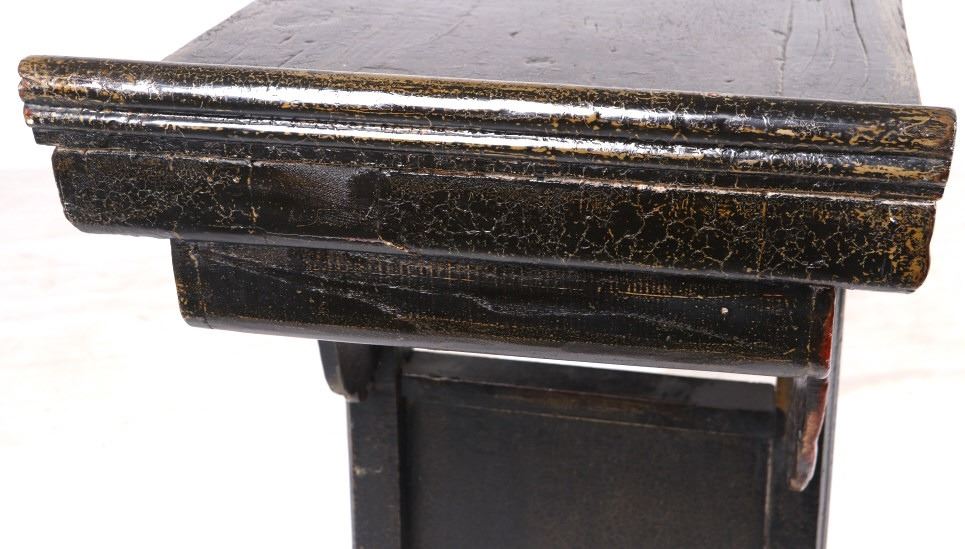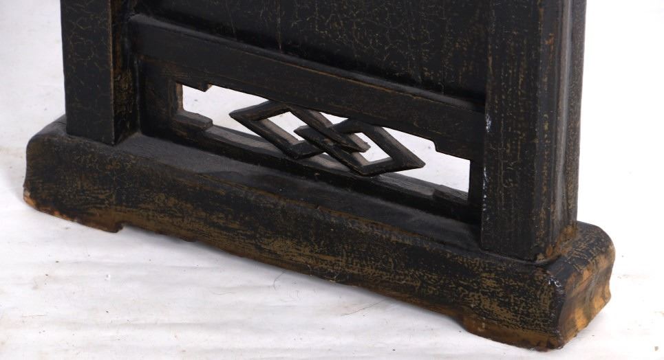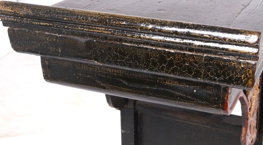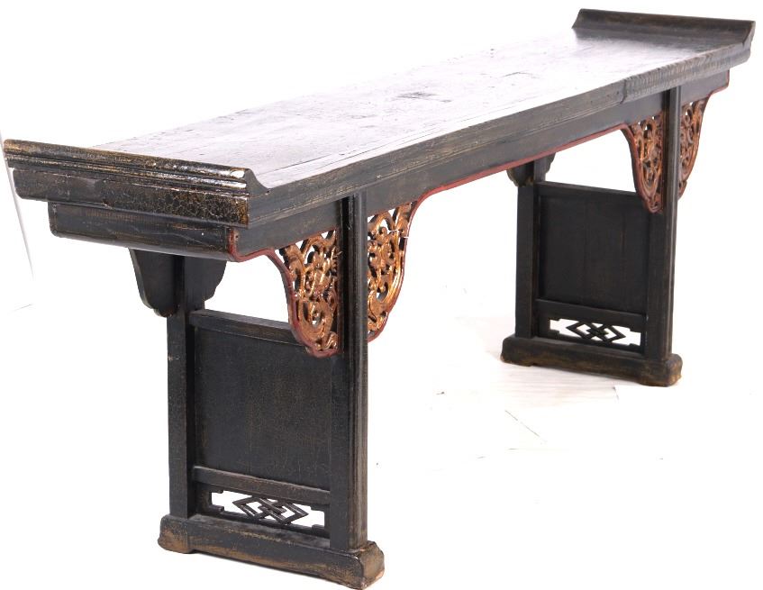 For your consideration is this Chinese, hardwood altar table with carved lattice. The altar table shows solid, sturdy construction, boasting a long structure frame and everted ends with a hand-carved lattice on either side of the legs of this altar table. The table is painted black and the squandrels painted red. The condition of this alter table is good, showing wear to the top coat of the paint and a minor repair to the trim on the right-hand side of the alter table. The measurements of this table are 35" x 104" x 20 1/2".