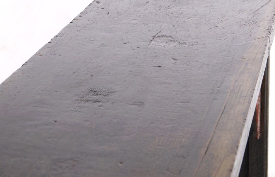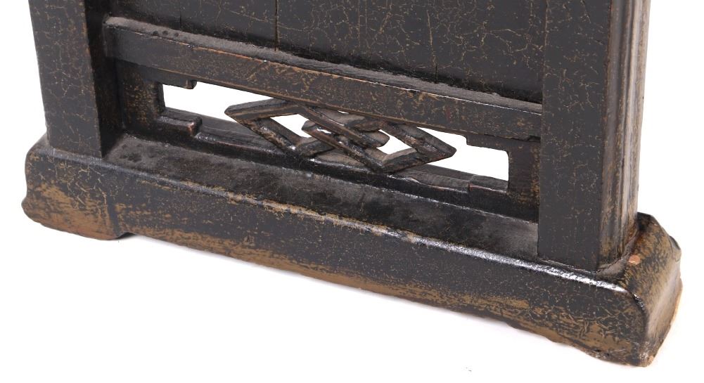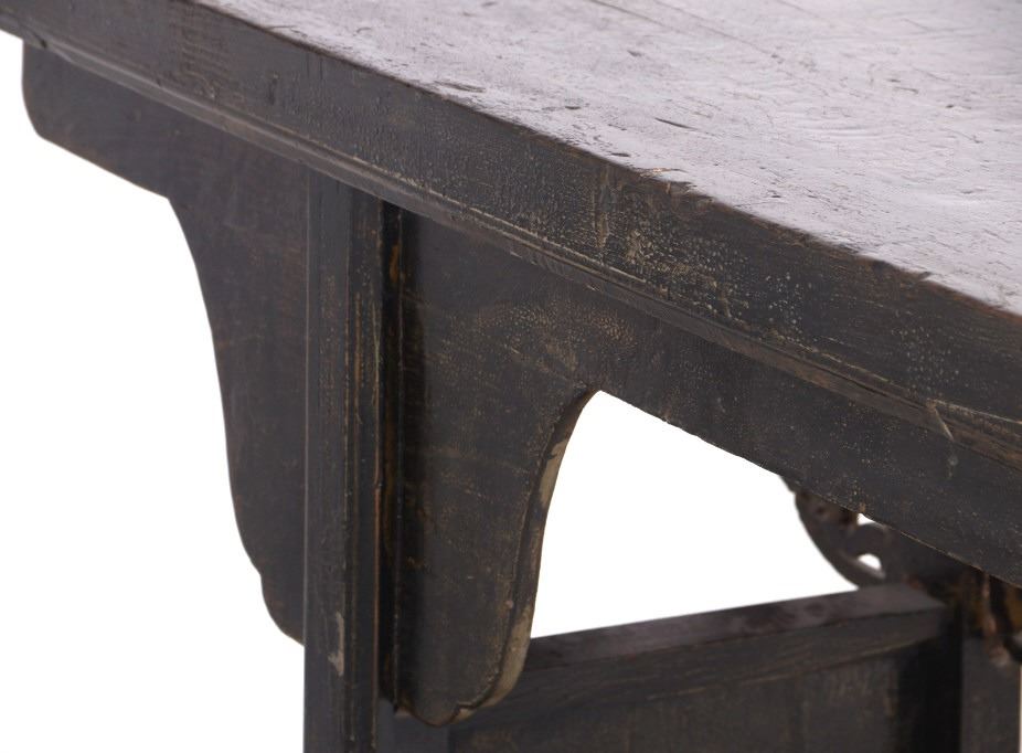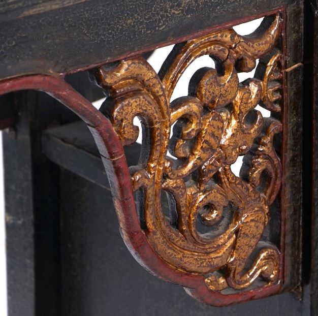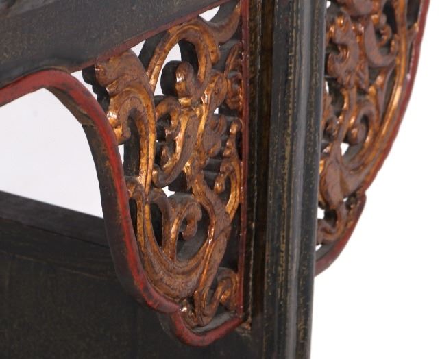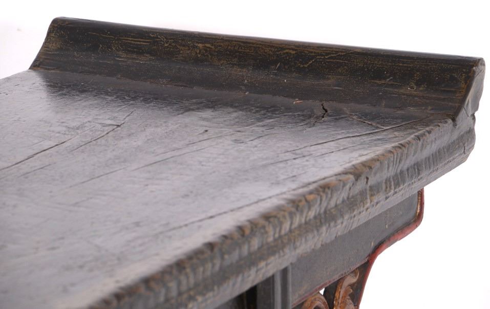 For your consideration is this Chinese, hardwood altar table with carved lattice. The altar table shows solid, sturdy construction, boasting a long structure frame and everted ends with a hand-carved lattice on either side of the legs of this altar table. The table is painted black and the squandrels painted red. The condition of this alter table is good, showing wear to the top coat of the paint and a minor repair to the trim on the right-hand side of the alter table. The measurements of this table are 35" x 104" x 20 1/2".