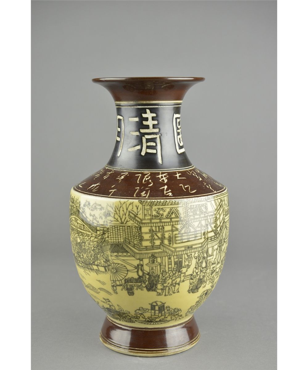 Chinese brown glazed and painted porcelain vase; high-shouldered ovoid body featuring painted town scene set against brown glazed vase; base unglazed; H: 29 cm, D: 18 cm; Provenance: Private Richmond Hill collector