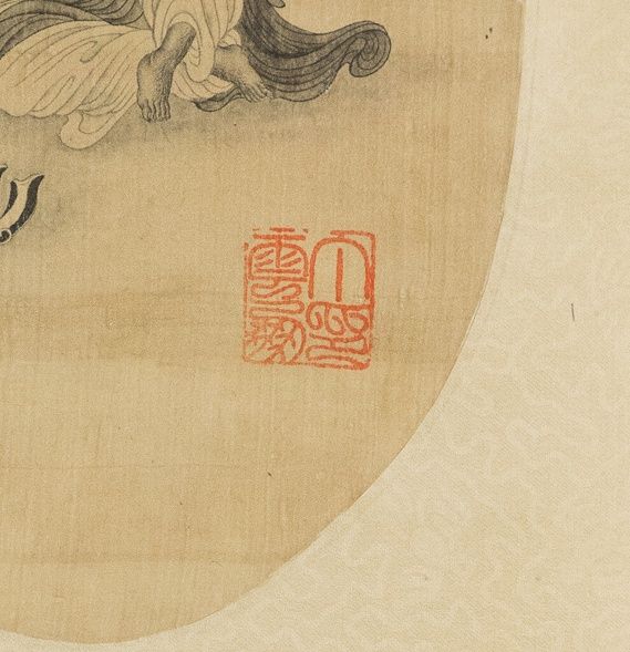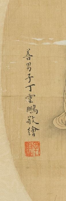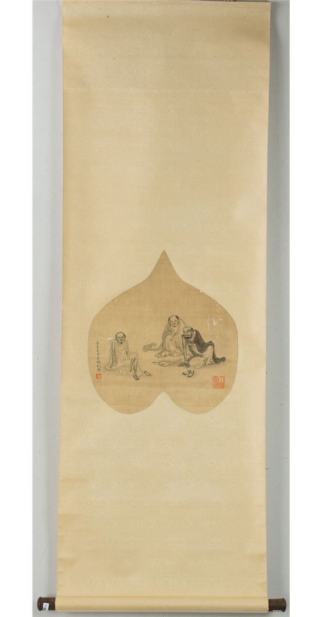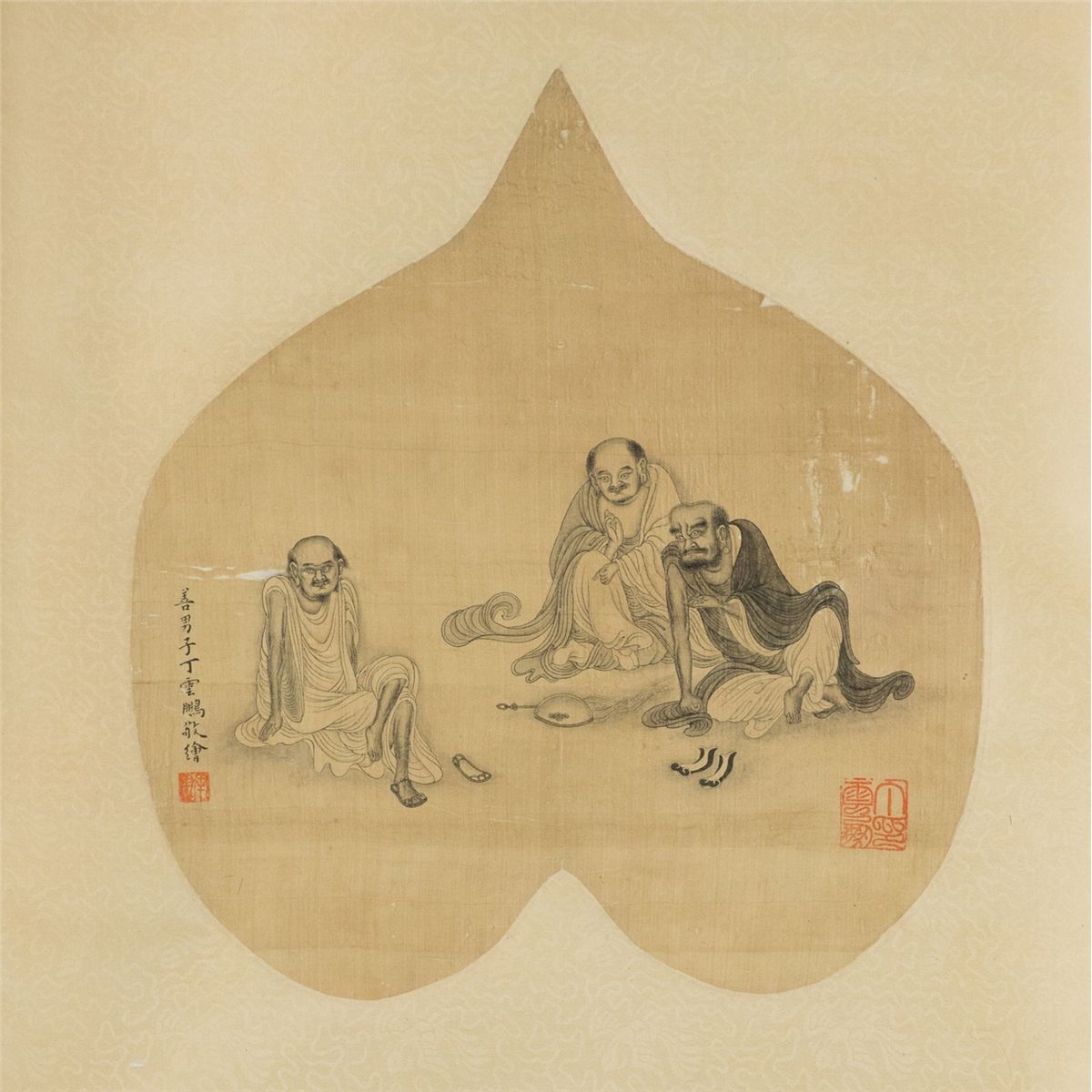 Three monks, hanging scroll, Chinese ink on silk, signed and sealed After Ding Yun Peng (1584-1638); 34 cm x 36 cm