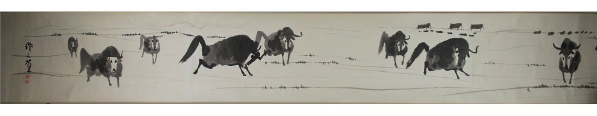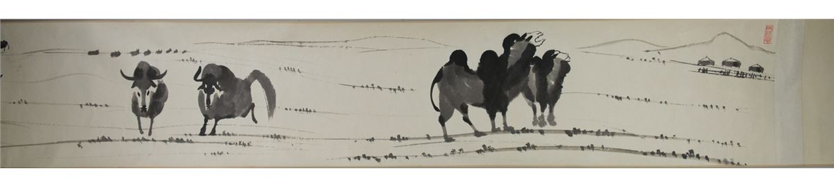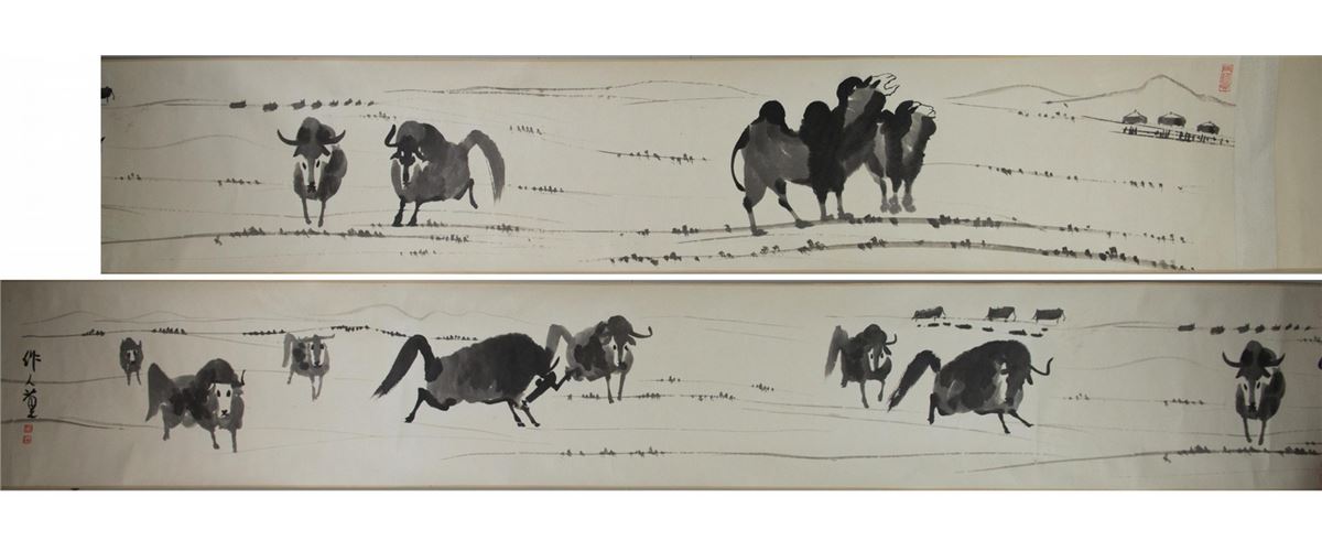 Camels and buffaloes, horizontal hanging scroll, Chinese ink on paper, signed Wu Zuo Ren with red seals. 32 cm x 220 cm. Provenance: T. Ng Collection Toronto.