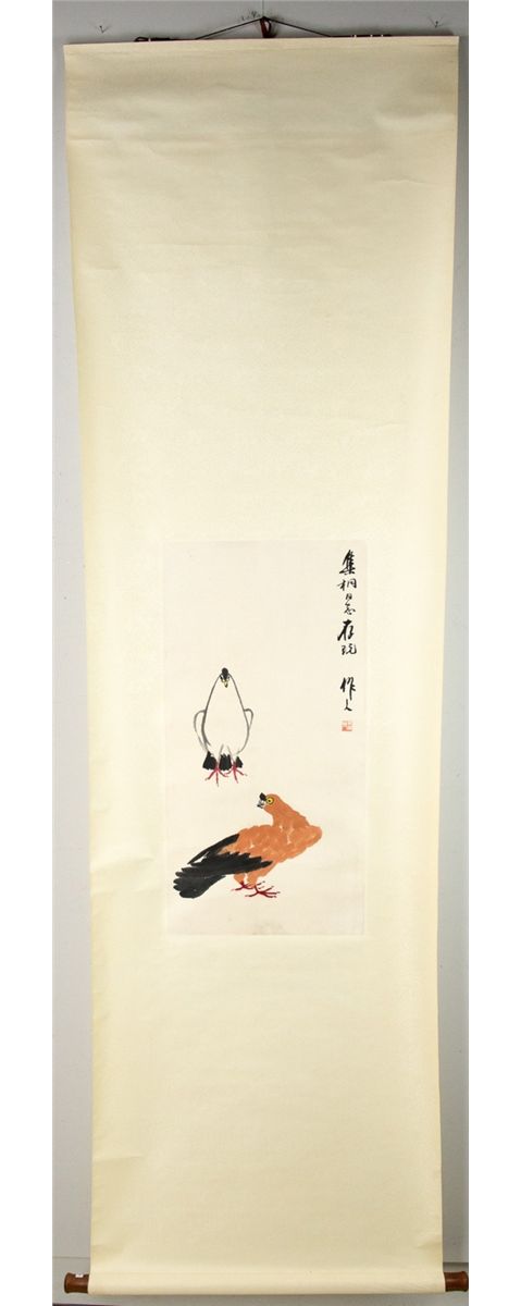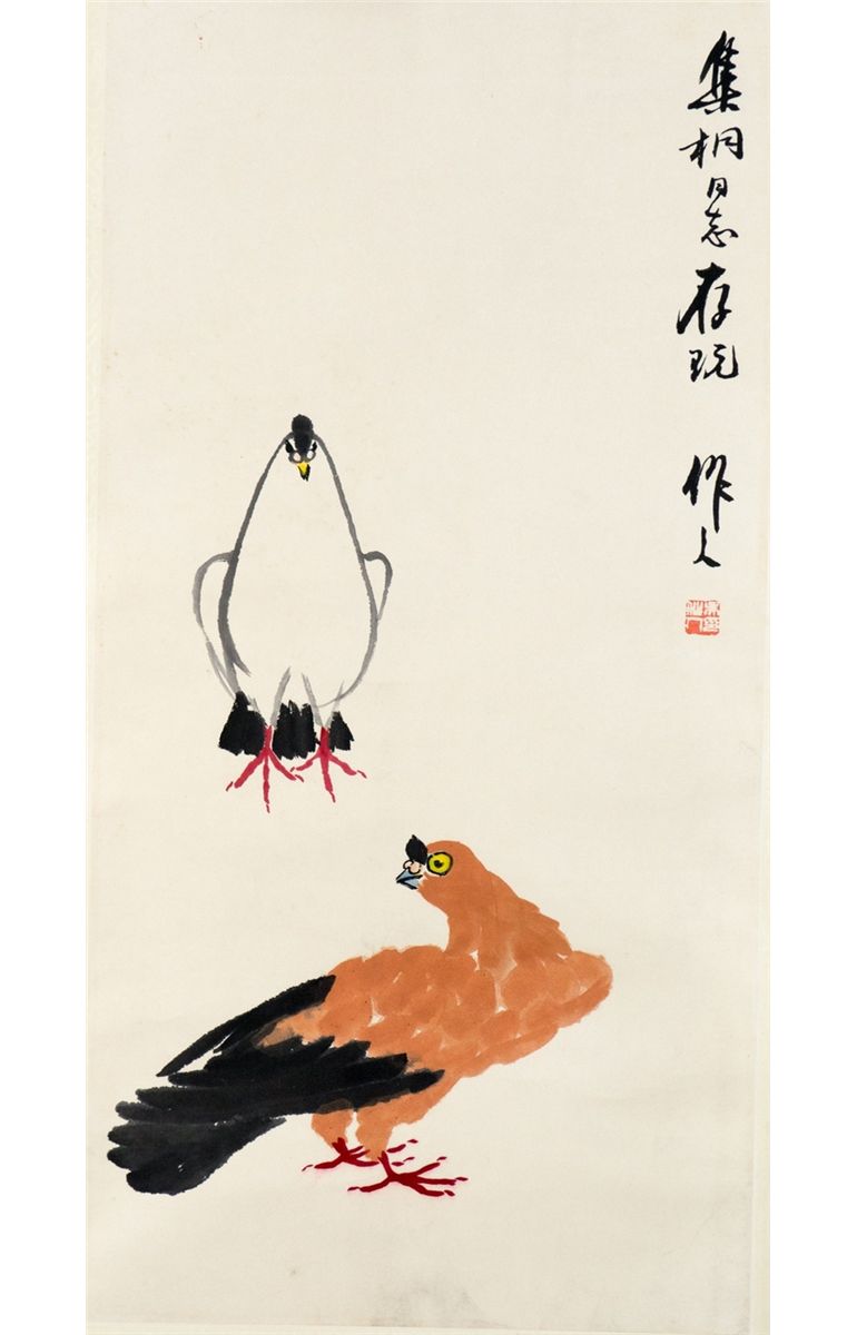 Two chickens, hanging scroll, Chinese ink and watercolour on paper, signed and sealed Wu Zuoren (1908?1997). 68 cm x 34 cm.