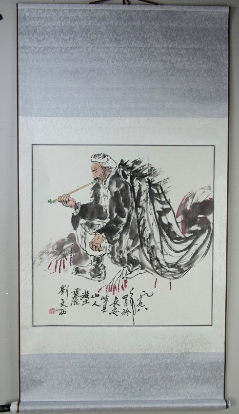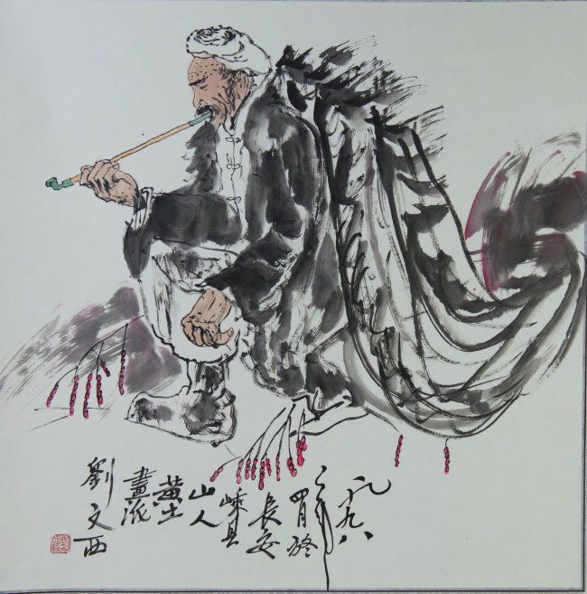 Old man smoking pipe, hanging scroll, Chinese ink and watercolour on paper, signed Liu Wenxi (b1933) and inscribed with red seal, dated 1998; 85 cm x 70 cm