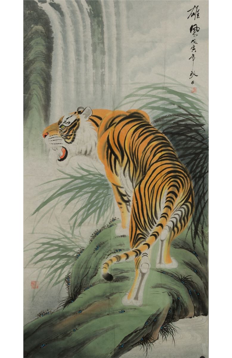 Roaring tiger, Chinese ink and watercolour on paper, with two red seals. 133 cm x 69 cm.
