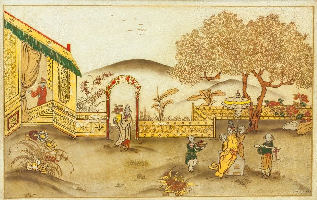 Painting on board, framed. Featuring imperial garden scene. A figure in gold robes rest in a courtyard with servants. Signed "M. VICARY" to the bottom right corner. with "1954" inscribed beneath it. Board size: 44 x 70 cm (17 x 27.5 inches). Frame size: 53 x 78 cm (21 x 30.5 inches).