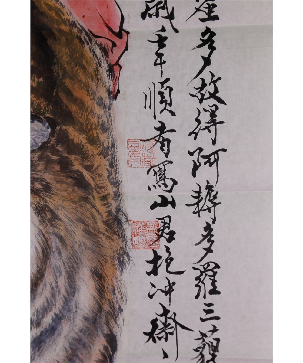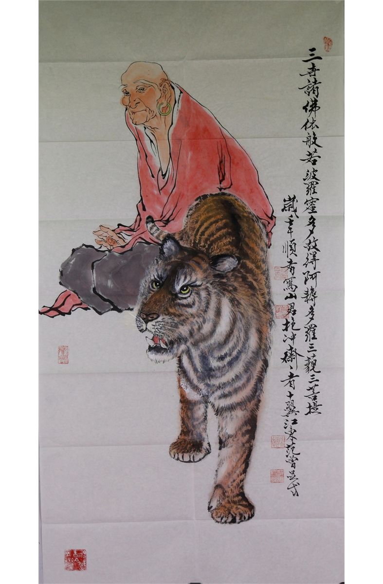 Arhat with tiger; Chinese ink and watercolour on paper; signed Fan Zeng and inscribed with seven artist seals; 138 cm x 70 cm