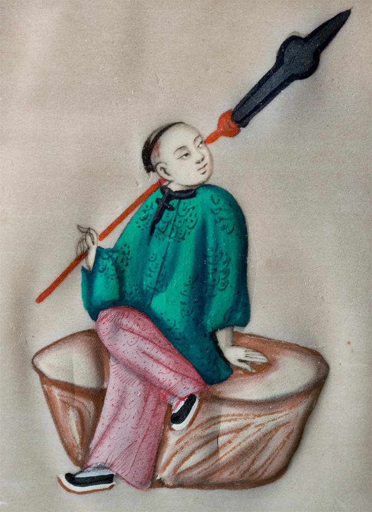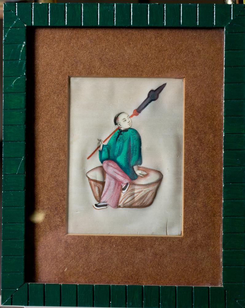 Finely painted to depict a boy on a stool with a spear 5.25"H X 4"W sight, 10"H X 8"W framed circa late 19th century.